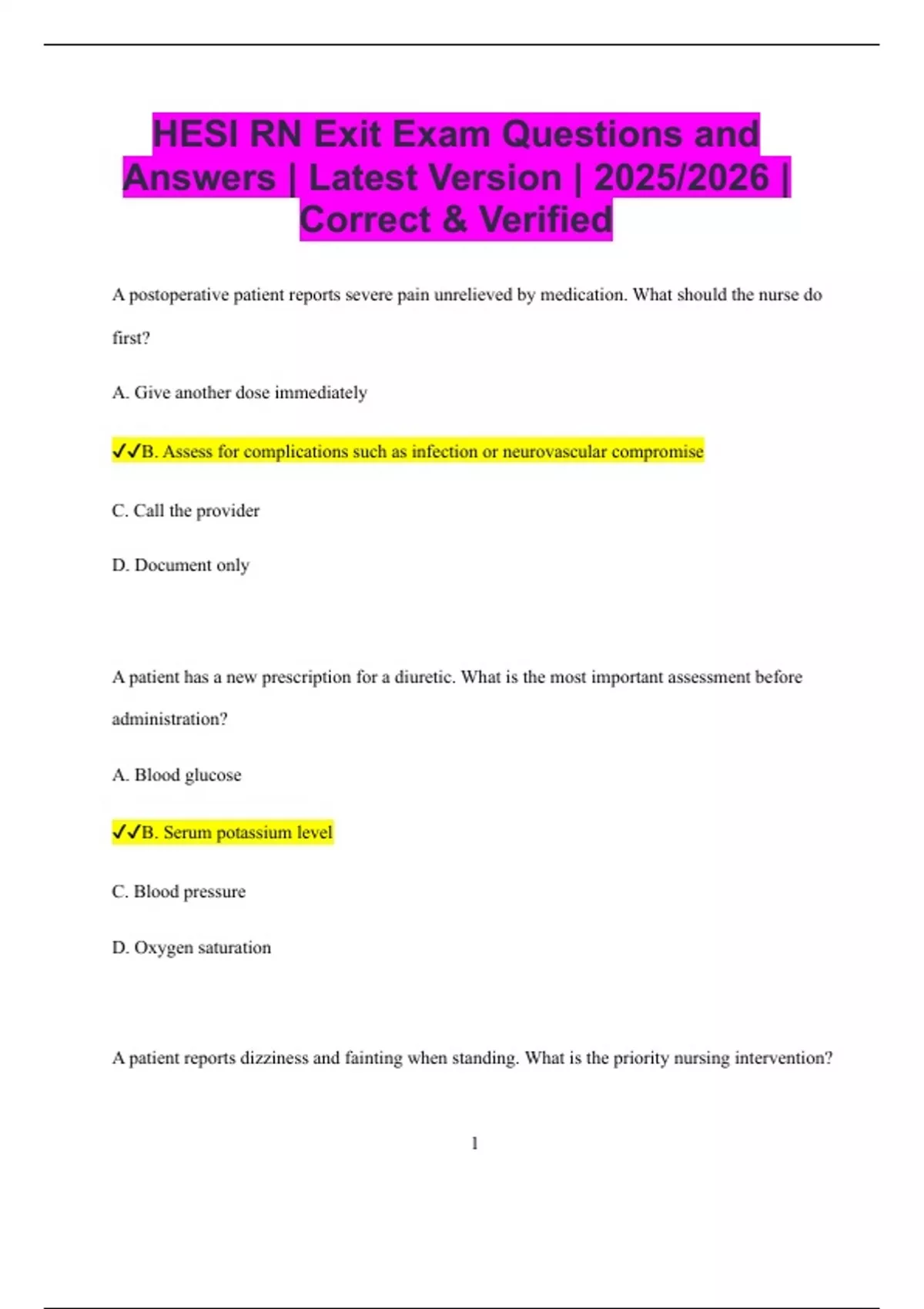 ,✔✔A. Assist the patient to sit or lie down and assess vital signs