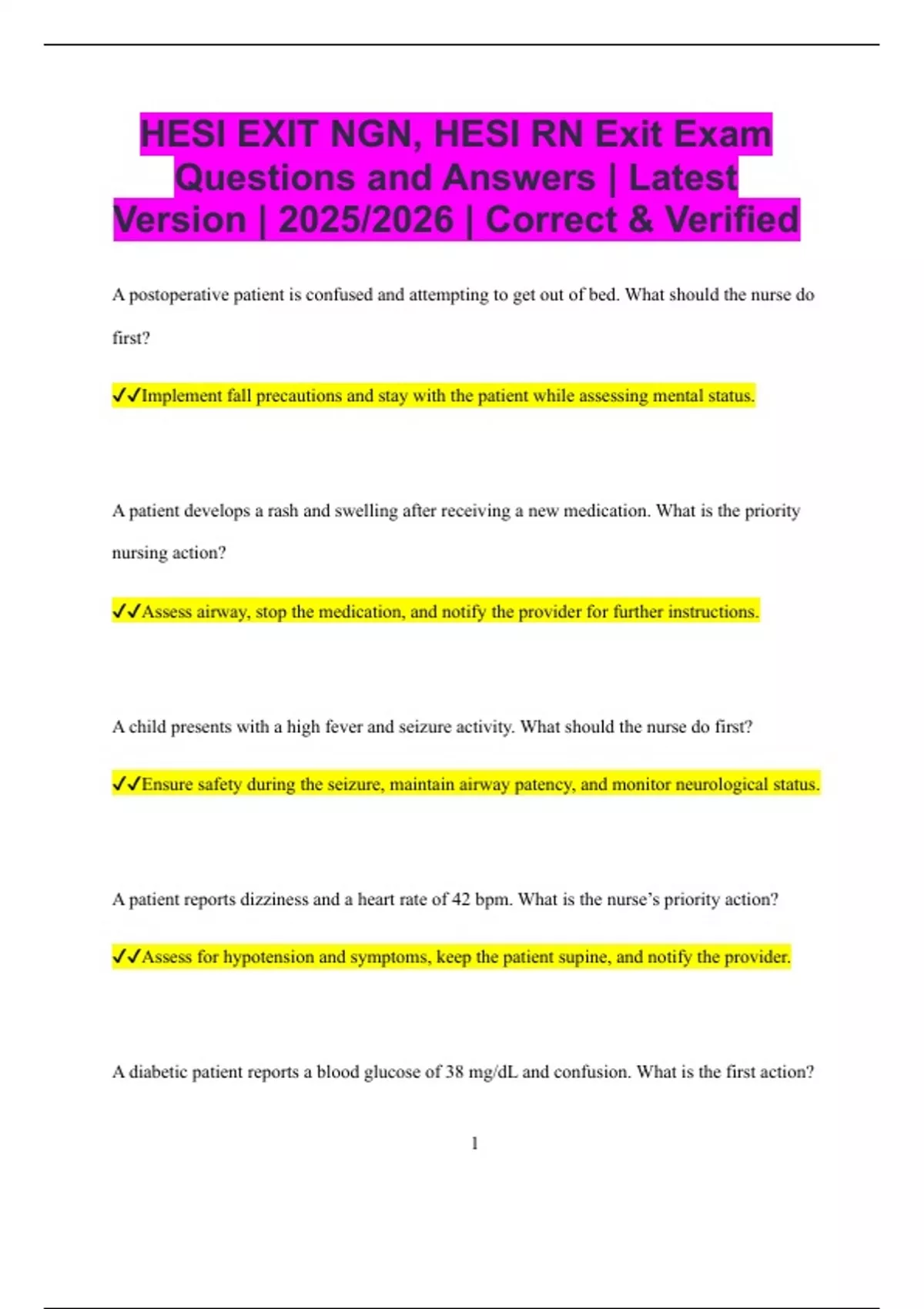 ✔✔Implement fall precautions and stay with the patient while assessing mental status.