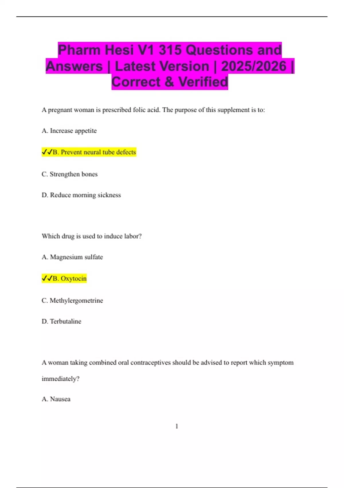 Pharm Hesi V1 315 Questions and Answers | Latest Version | 2025/2026 | Correct & Verified A pregnant woman is prescribed folic acid. The purpose of this supplement is to: A. Increase appetite B. Prevent neural tube defects C. Strengthen bones D. Reduce morning sickness Which drug is used to induce labor? A. Magnesium sulfate B. Oxytocin C. Methylergometrine D. Terbutaline A woman taking combined oral contraceptives should be advised to report which symptom immediately? A. Nausea 2 B. Leg pain and swelling C. Breast tenderness D. Weight gain Which medication is given to prevent seizures in preeclampsia? A. Labetalol B. Hydralazine C. Magnesium sulfate D. Diazepam Which gynecological medication is contraindicated in pregnancy due to risk of uterine contractions? A. Misoprostol B. Progesterone C. Folic acid D. Iron supplements A patient prescribed clomiphene is likely being treated for: 3 A. Endometriosis B. Infertility C. Hypertension D. Dysmenorrhea Which adverse effect is most common with medroxyprogesterone injection (Depo-Provera)? A. Irregular menstrual bleeding B. Increased hair growth C. Severe headache D. Vision changes What is the purpose of Rho(D) immune globulin administration postpartum? A. Treat infection B. Prevent Rh sensitization C. Increase milk production D. Reduce bleeding Which antibiotic is contraindicated in pregnancy due to fetal bone and teeth effects? 4 A. Tetracycline B. Penicillin C. Cephalexin D. Azithromycin A woman is prescribed mifepristone. The purpose of this drug is: A. Medical termination of pregnancy B. Relief of dysmenorrhea C. Induction of ovulation D. Prevention of infection Which drug is prescribed to manage postpartum hemorrhage? A. Betamethasone B. Methylergometrine