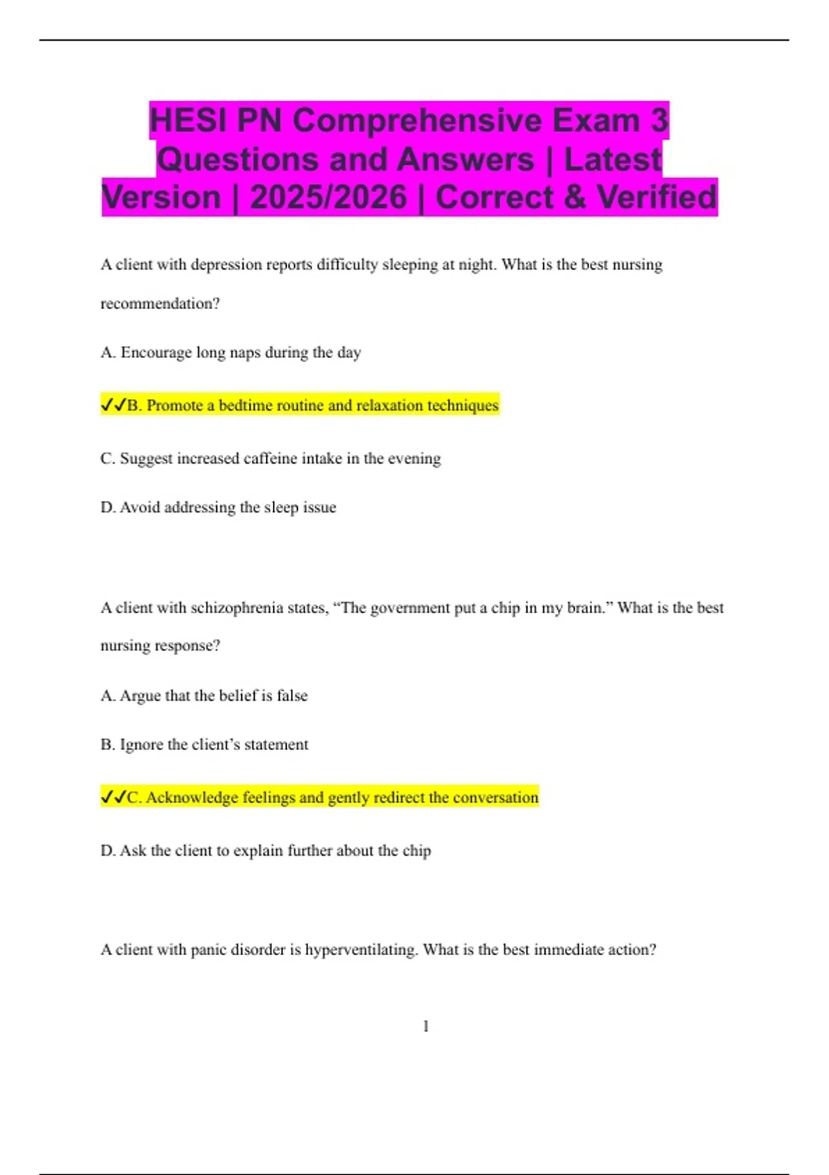 HESI PN Comprehensive Exam 3 Questions and Answers | Latest Version | 2025/2026 | Correct & Verified A client with depression reports difficulty sleeping at night. What is the best nursing recommendation? A. Encourage long naps during the day B. Promote a bedtime routine and relaxation techniques C. Suggest increased caffeine intake in the evening D. Avoid addressing the sleep issue A client with schizophrenia states, “The government put a chip in my brain.” What is the best nursing response? A. Argue that the belief is false B. Ignore the client’s statement C. Acknowledge feelings and gently redirect the conversation D. Ask the client to explain further about the chip A client with panic disorder is hyperventilating. What is the best immediate action? 2 A. Administer a sedative immediately B. Encourage slow, deep breathing into cupped hands C. Tell the client to ignore the sensations D. Leave the client alone to calm down A client with bipolar disorder is in a manic phase and pacing constantly. What is the priority intervention? A. Offer complex problem-solving activities B. Provide a safe environment and allow physical movement C. Encourage group discussions D. Limit all client activity completely A patient with obsessive-compulsive disorder spends hours washing hands. What is the best nursing intervention? A. Stop the client from washing immediately B. Allow handwashing within limits and gradually set boundaries C. Punish the client for repetitive behavior D. Pretend not to notice the behavior 3 A client diagnosed with PTSD reports frequent nightmares. Which intervention is most helpful? A. Encourage alcohol use before bed to induce sleep B. Provide a calm environment and teach grounding techniques C. Suggest avoidance of all discussions about trauma D. Promote daytime isolation A client is severely depressed and expresses hopelessness. What is the priority nursing action? A. Assess the client for suicidal ideation B. Provide high-calorie snacks C. Schedule recreational activities D. Encourage daily journaling A client reports hearing voices telling them to hurt others. What is the nurse’s priority? A. Provide relaxation exercises B. Ensure safety and notify the healthcare provider C. Ask the client to sing to block out the voices D. Offer reading material 4 A client with generalized anxiety disorder asks why relaxation techniques are important. A. They reduce the need for sleep B. They increase stress levels C. They decrease physical symptoms of anxiety D. They prevent all future anxiety attacks A client with borderline personality disorder expresses feelings of abandonment. What is the best response? A. Acknowledge feelings and maintain consistent boundaries B. Promise the client they will never be left alone C. Avoid interacting with the client to prevent conflict D. Offer to stay with the client indefinitely A client with alcohol use disorder begins to tremble and sweat 8 hours after the last drink. What condition is suspected? A. Alcohol intoxication