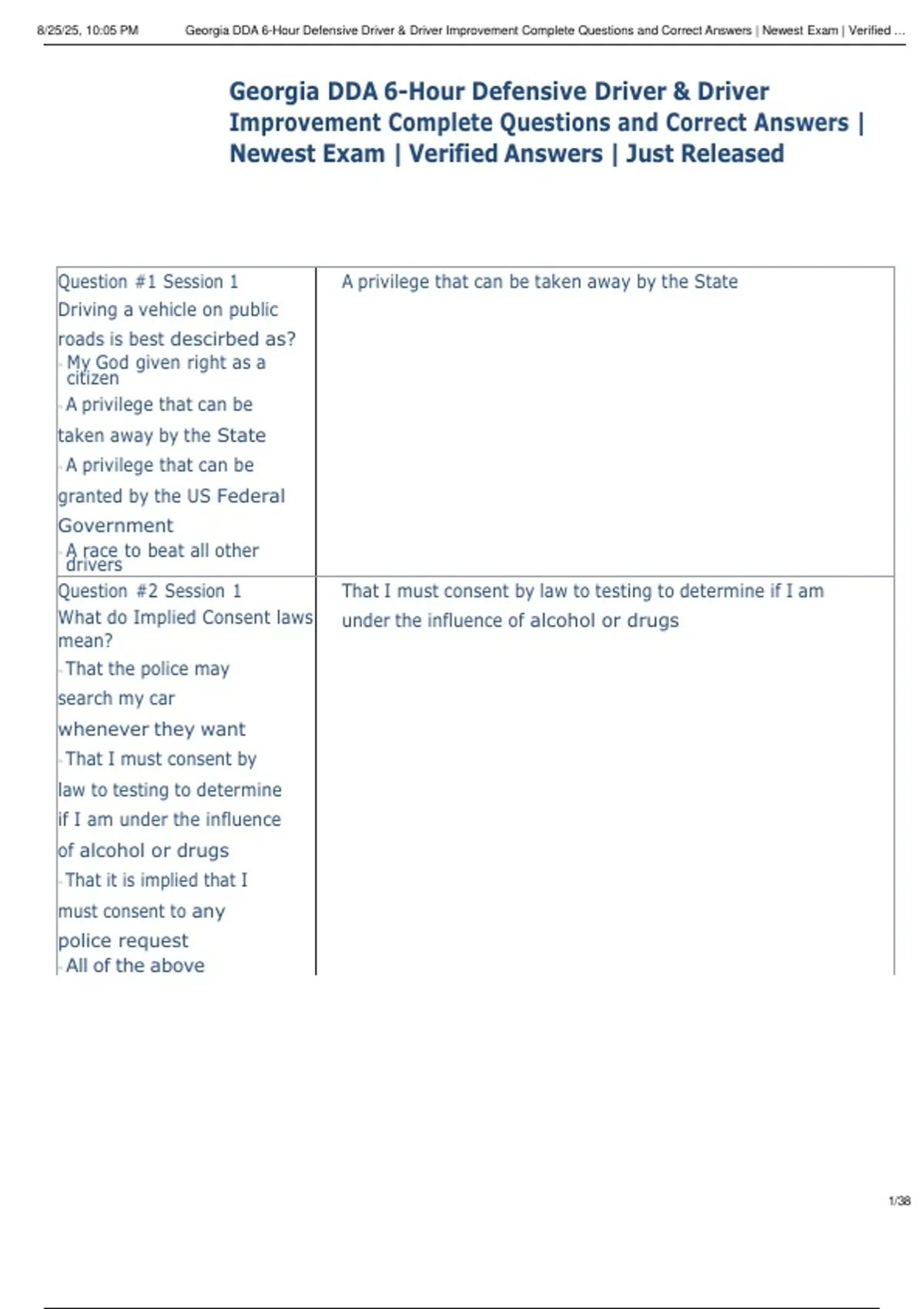 , 8/25/25, 10:05 PM Georgia DDA 6-Hour Defensive Driver & Driver Improvement Complete Questions and Correct Answers | Newest Exam | Verified …