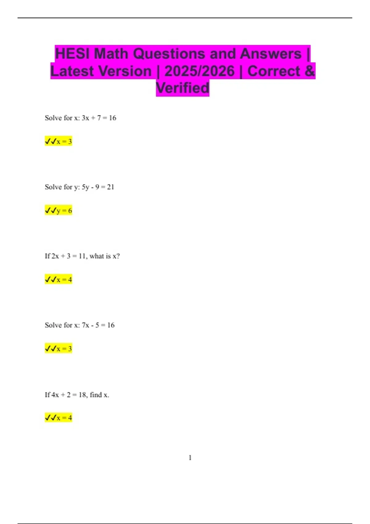 HESI Math Questions and Answers | Latest Version | 2025/2026 | Correct & Verified Solve for x: 3x + 7 = 16 x = 3 Solve for y: 5y - 9 = 21 y = 6 If 2x + 3 = 11, what is x? x = 4 Solve for x: 7x - 5 = 16 x = 3 If 4x + 2 = 18, find x. x = 4 2 Solve for y: 9y + 1 = 28 y = 3 Solve for x: 8x - 12 = 20 x = 4 If 6x + 5 = 35, what is x? x = 5 Solve for y: 3y - 7 = 2 y = 3 If 7x + 6 = 27, solve for x. x = 3 Solve: 5x - 8 = 12 x = 4 3 If 2x + 9 = 17, find x. x = 4 Solve for y: 4y + 3 = 19 y = 4 If 6x - 4 = 14, solve for x. x = 3 Solve: 3x + 8 = 20 x = 4 If 5y - 7 = 18, what is y? y = 5 Solve for x: 2x + 11 = 19