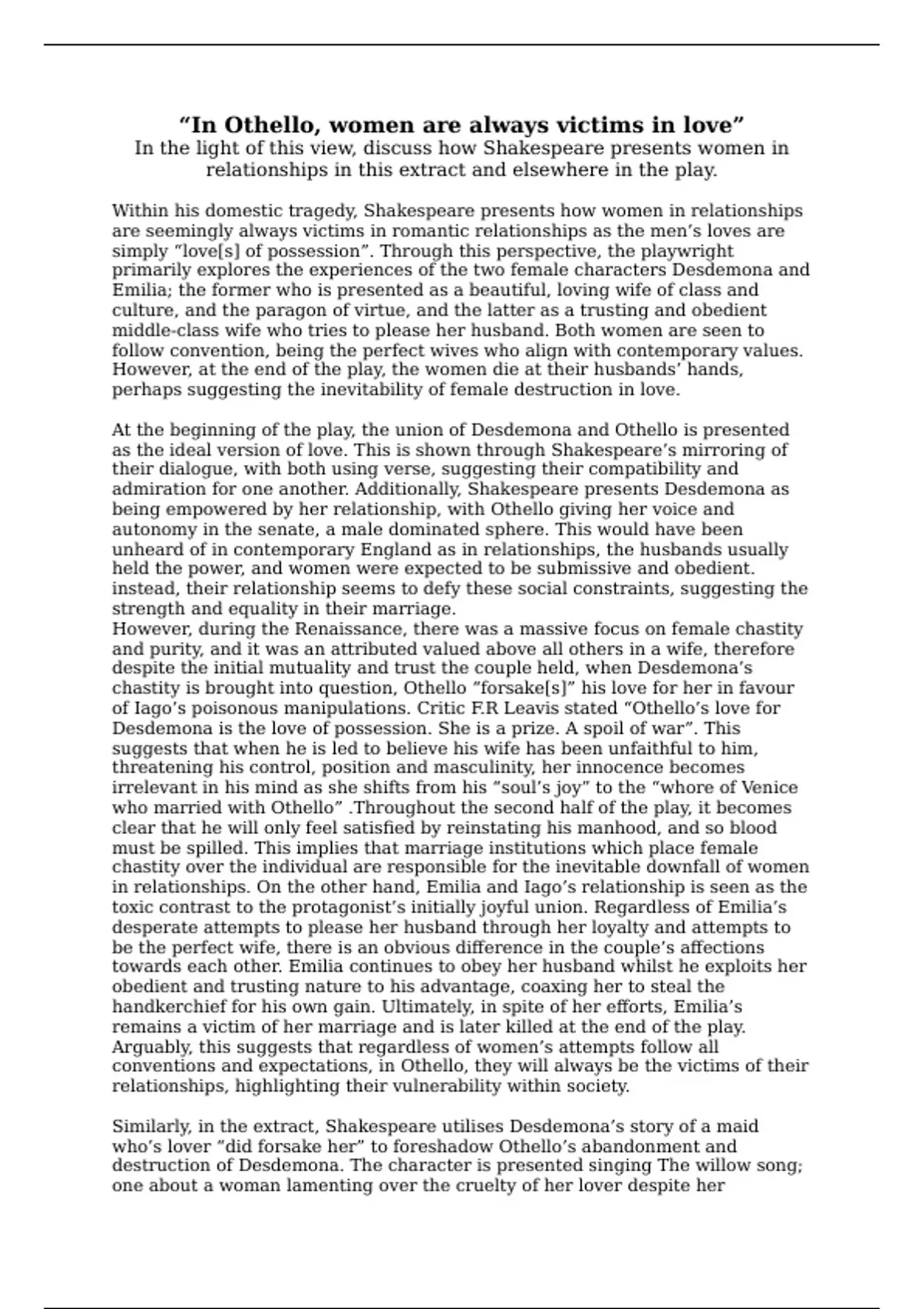 Summary Grade A AQA Othello Essay on Women as Victims of Love