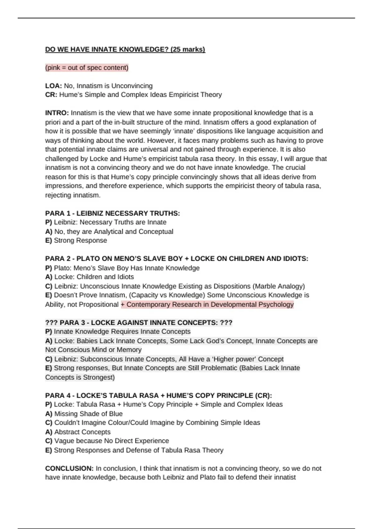 'Do we have innate knowledge' A Level 25 marker essay + plan