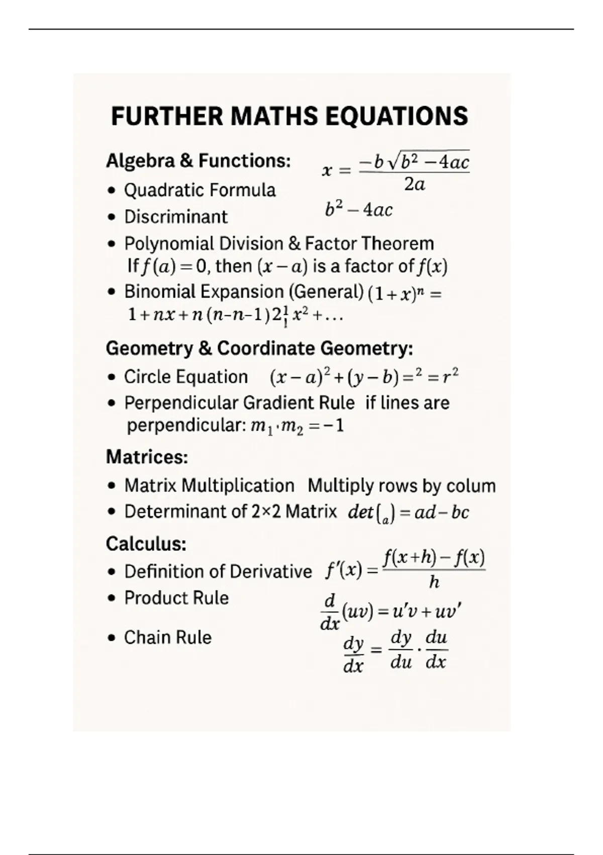 This document presents a structured overview of key equations taught in GCSE Further Mathematics, excluding standard GCSE content. It categorizes formulas across algebra, geometry, matrices, and introductory calculus