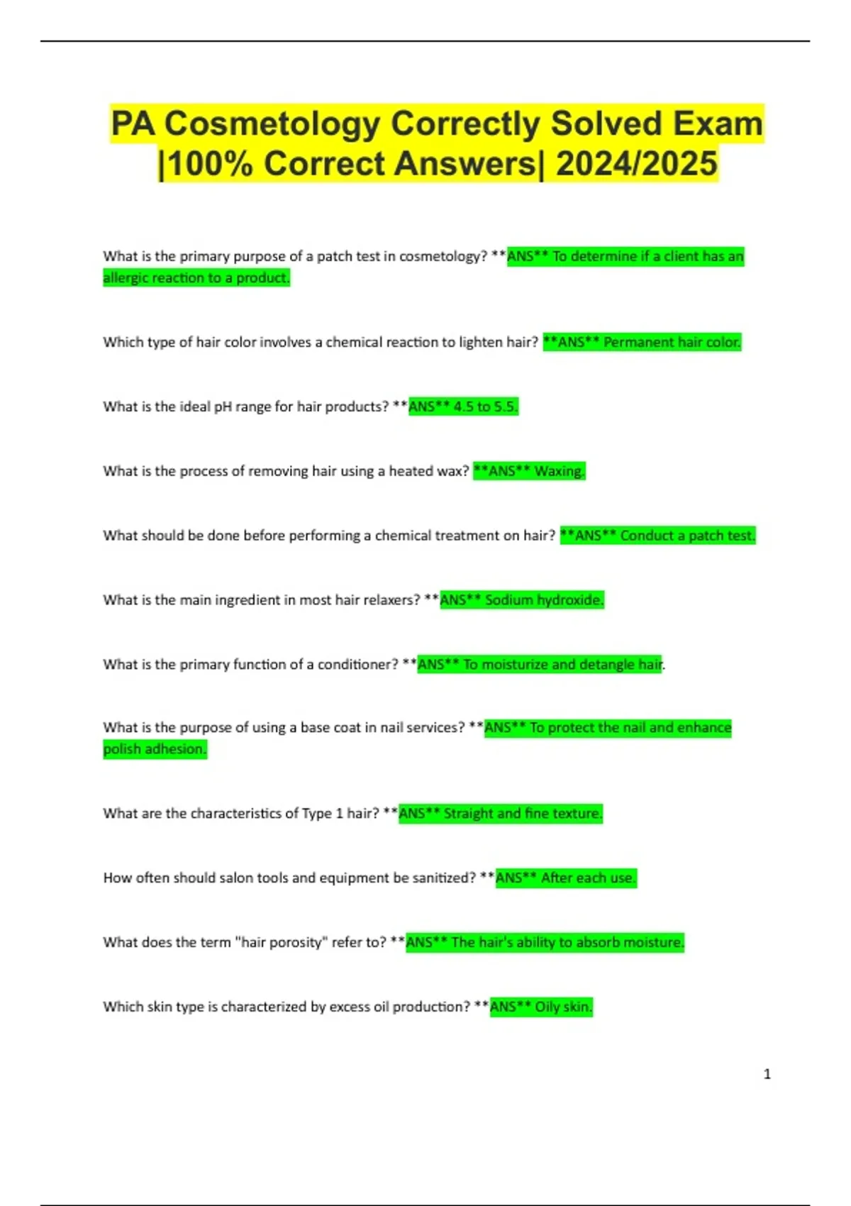 PA Cosmetology Correctly Solved Exam |100% Correct Answers| 2024/2025 What is the primary purpose of a patch test in cosmetology? **ANS** To determine if a client has an allergic reaction to a product. Which type of hair color involves a chemical reaction to lighten hair? **ANS** Permanent hair color. What is the ideal pH range for hair products? **ANS** 4.5 to 5.5. What is the process of removing hair using a heated wax? **ANS** Waxing. What should be done before performing a chemical treatment on hair? **ANS** Conduct a patch test. What is the main ingredient in most hair relaxers? **ANS** Sodium hydroxide. What is the primary function of a conditioner? **ANS** To moisturize and detangle hair. What is the purpose of using a base coat in nail services? **ANS** To protect the nail and enhance polish adhesion. What are the characteristics of Type 1 hair? **ANS** Straight and fine texture. How often should salon tools and equipment be sanitized? **ANS** After each use. What does the term "hair porosity" refer to? **ANS** The hair's ability to absorb moisture. Which skin type is characterized by excess oil production? **ANS** Oily skin. 1 What is the correct way to dispose of single-use items in a salon? **ANS** In a designated biohazard container. What is the role of the cuticle in nail health? **ANS** To protect the nail matrix. Which type of chemical curl is considered the most gentle? **ANS** Soft curl perm. What should be done to prevent cross-contamination in a salon? **ANS** Use disposable tools and sanitize equipment. What is the primary function of a toner in hair coloring? **ANS** To neutralize unwanted tones. How should you treat a client with a sensitive scalp? **ANS** Use gentle, hypoallergenic products. What is the main advantage of using organic hair products? **ANS** They are generally free from harsh chemicals. What type of massage technique is commonly used in facials? **ANS** Effleurage. What is the purpose of a facial mask? **ANS** To hydrate, purify, or exfoliate the skin. What does the term "ventilation" refer to in a salon? **ANS** The circulation of fresh air to reduce fumes and odors. What is the best way to protect the skin during a chemical peel? **ANS** Apply a barrier cream. What is the purpose of using a disinfectant in the salon? **ANS** To kill harmful bacteria and viruses. What is the ideal temperature for a hot towel treatment? **ANS** Approximately 160°F (71°C). 2 How often should a scalp massage be performed during a shampoo? **ANS** Every shampoo service. What are the effects of over-processing hair? **ANS** Dryness, breakage, and loss of elasticity. What is the most common form of hair removal used in salons? **ANS** Waxing. What is the purpose of the first aid kit in a salon? **ANS** To provide immediate care for injuries or emergencies. What is the primary benefit of using a deep conditioning treatment? **ANS** To restore moisture and repair damage. How can you determine a client's skin type? **ANS** By assessing their skin's oiliness, dryness, and sensitivity. What is the role of a licensed cosmetologist in client education? **ANS** To inform clients about proper care and product usage. What is the purpose of a skin analysis? **ANS** To assess skin condition and determine appropriate treatments. Which ingredient is commonly used in anti-aging products? **ANS** Retinol. What is the main benefit of using essential oils in cosmetology? **ANS** They can enhance relaxation and improve skin health. What is a key consideration when selecting a hair color for a client? **ANS** The client's natural undertone. What should be done if a client shows signs of allergic reaction during a service? **ANS** Stop the service immediately and provide first aid. 3 What is the primary purpose of using gloves during a service? **ANS** To protect the skin from chemicals and maintain hygiene. What type of brush is best for smoothing out hair during blow-drying? **ANS** A round brush. What is the benefit of performing a strand test before coloring hair? **ANS** To assess the hair's reaction to the color. What is the main reason for performing regular salon cleaning and maintenance? **ANS** To ensure a safe and hygienic environment. What does "bleaching" hair do to its color? **ANS** It removes pigment from the hair. What is the typical shelf life of most opened skincare products? **ANS** 6 to 12 months. What is the function of an emollient in skincare? **ANS** To soften and soothe the skin. What should you do if a client arrives with a service-related complaint? **ANS** Listen to their concerns and address the issue professionally. What is the role of the cuticle in hair growth? **ANS** To protect the inner layers of the hair shaft. Under-processing is caused by **Ans**insufficient processing time Which of the following guidelines is true if your client has a round facial shape? **Ans**add height at the crown A client as a level 7 red-orange brassy looking hair. What is the best choice for neutralizing this color? **Ans**level 6 blue-green 4 Do NOT give a permanent wave if what exists? **Ans**scalp abrasions The chemical often required in addition to the chemical relaxer is **Ans**stabilizer .6) Which of the following is considered a cool color? A. blue B. brown C. red D. yellow **Ans**A. blue Q.7) You should apply waving lotion to the A. top of each rod only B. top and bottom of each rod C. area between the rods D. top hairline and allow it to drip down **Ans**B. top and bottom of each rod Which statement about hair lightening is CORRECT? A. very dark hair may be damaged by extreme lightening B. hair lighteners are used as preliminary treatments, never by themselves C. lighteners are not effective in removing undesirable off-shades D. lightening has no effect on hair's porosity **Ans**A. very dark hair may be damaged by extreme lightening ) Which bonds are individually very weak? A. hydrogen B. salt C. disulfide D. both A and B **Ans**D. both A and B 5 The relaxer cream is 