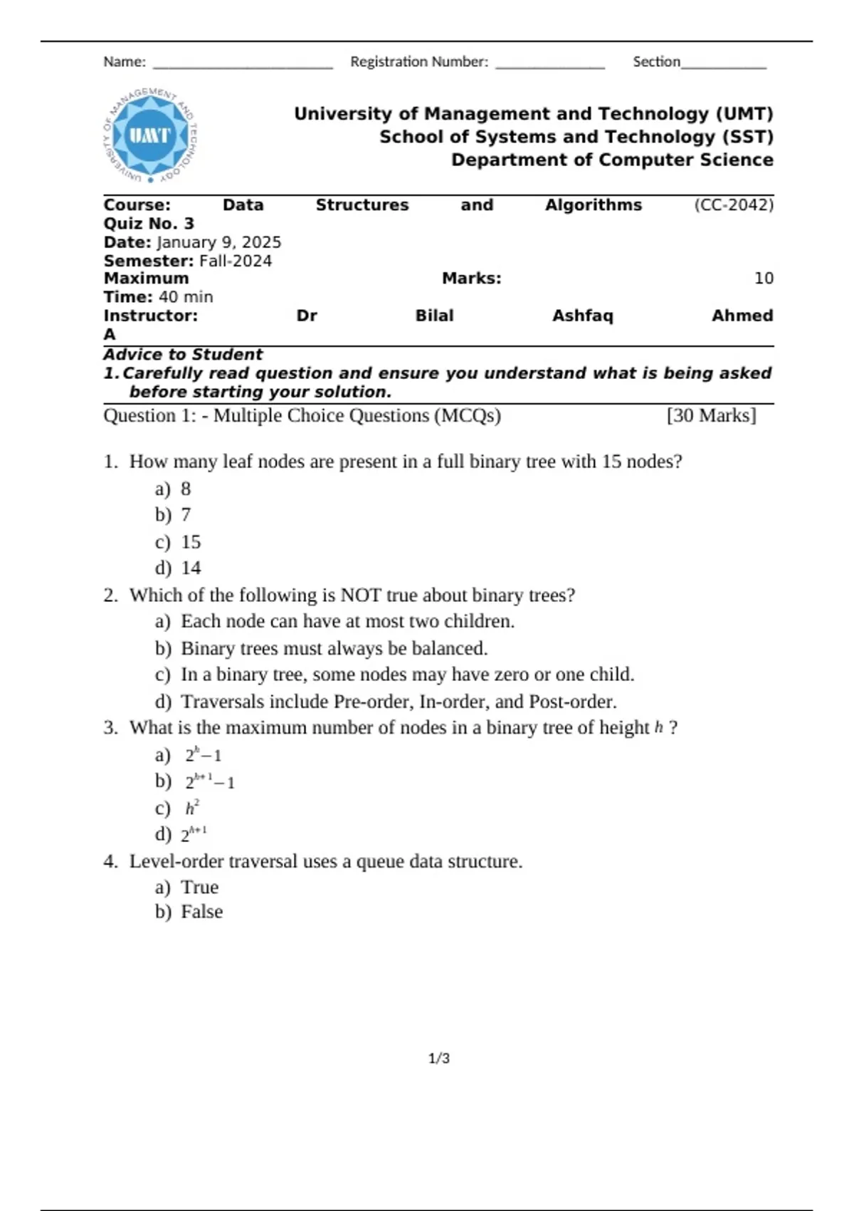 Question 1: - Multiple Choice Questions (MCQs) [30 Marks]