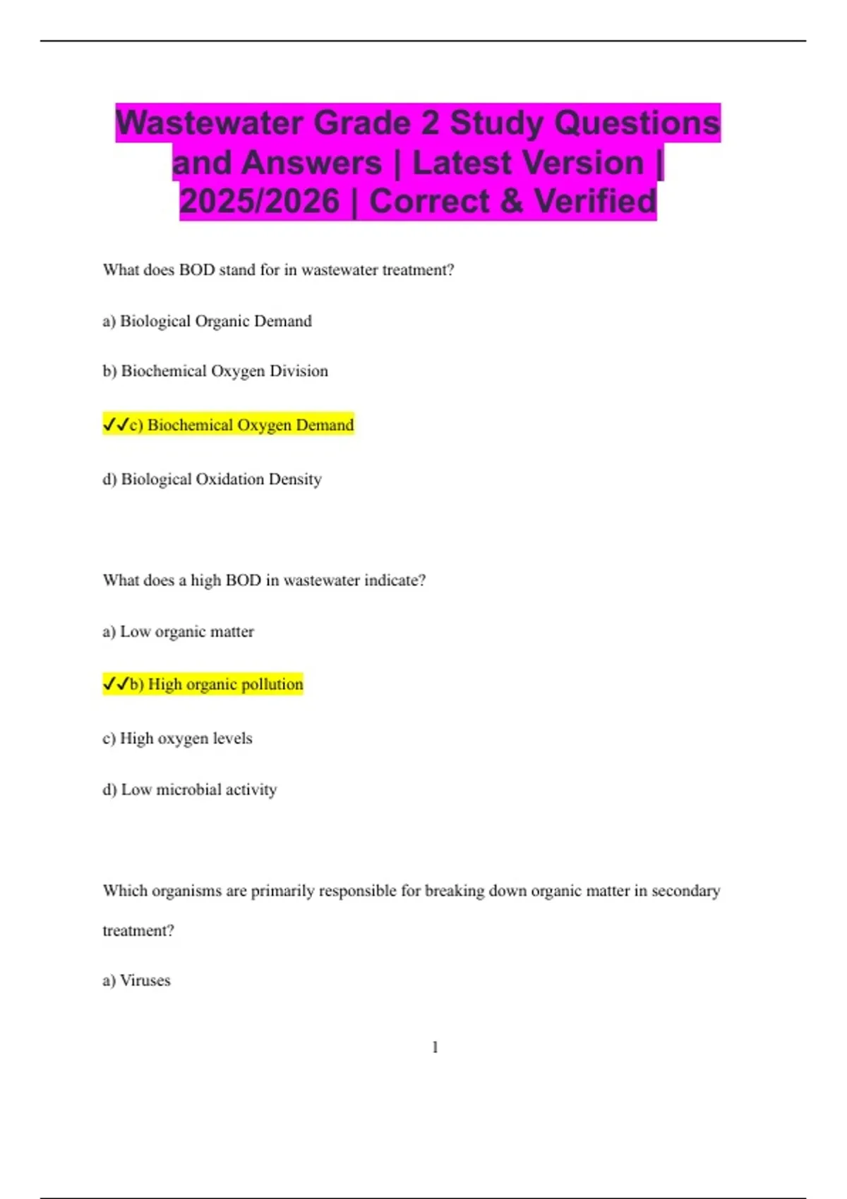 Wastewater Grade 2 Study Questions and Answers | Latest Version | 2025/2026 | Correct & Verified What does BOD stand for in wastewater treatment? a) Biological Organic Demand b) Biochemical Oxygen Division c) Biochemical Oxygen Demand d) Biological Oxidation Density What does a high BOD in wastewater indicate? a) Low organic matter b) High organic pollution c) High oxygen levels d) Low microbial activity Which organisms are primarily responsible for breaking down organic matter in secondary treatment? a) Viruses b) Protozoa c) Bacteria d) Algae What is the main function of an aeration tank? a) Remove grit b) Store wastewater c) Provide oxygen to microorganisms d) Separate sludge Why is chlorine added to treated wastewater? a) To increase alkalinity b) To disinfect and kill pathogens c) To add oxygen d) To remove nitrogen What is the purpose of a grit chamber? a) Remove oils b) Remove sand and heavy particles c) Remove dissolved gases d) Remove sludge Which type of sludge is produced during primary treatment? a) Activated sludge b) Raw sludge c) Digested sludge d) Anaerobic sludge What does TSS stand for? a) Total Salt Solids b) Total Suspended Solids c) Total Soluble Substances d) Total Settled Solids Why is dissolved oxygen important in activated sludge systems? a) To prevent foaming b) To support microbial activity