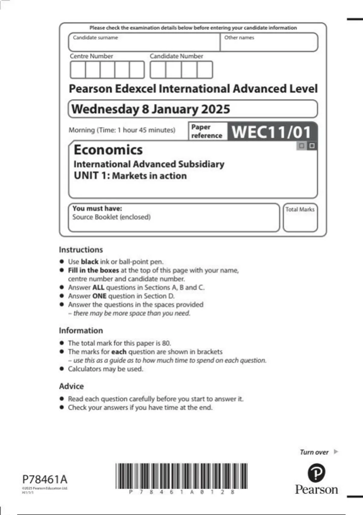 Pearson Edexcel IAL in Economics (WEC11)UNIT 1 JANUARY 2025 OFFICIAL QUESTION PAPER- Markets in action