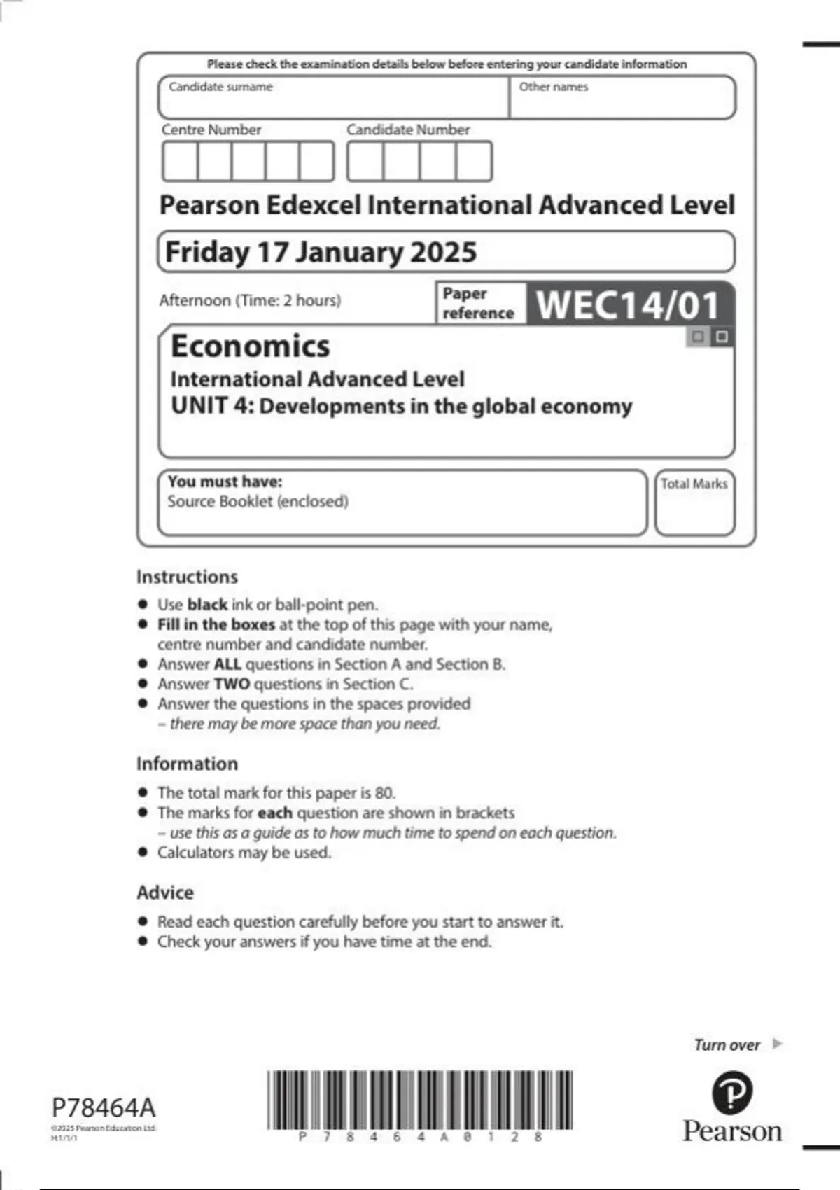 Pearson Edexcel IAL in Economics (WEC14)UNIT 4 JANUARY 2025 OFFICIAL QUESTION PAPER- Developments in the global economy THIS IS THE OFFICIAL DOCUMENT