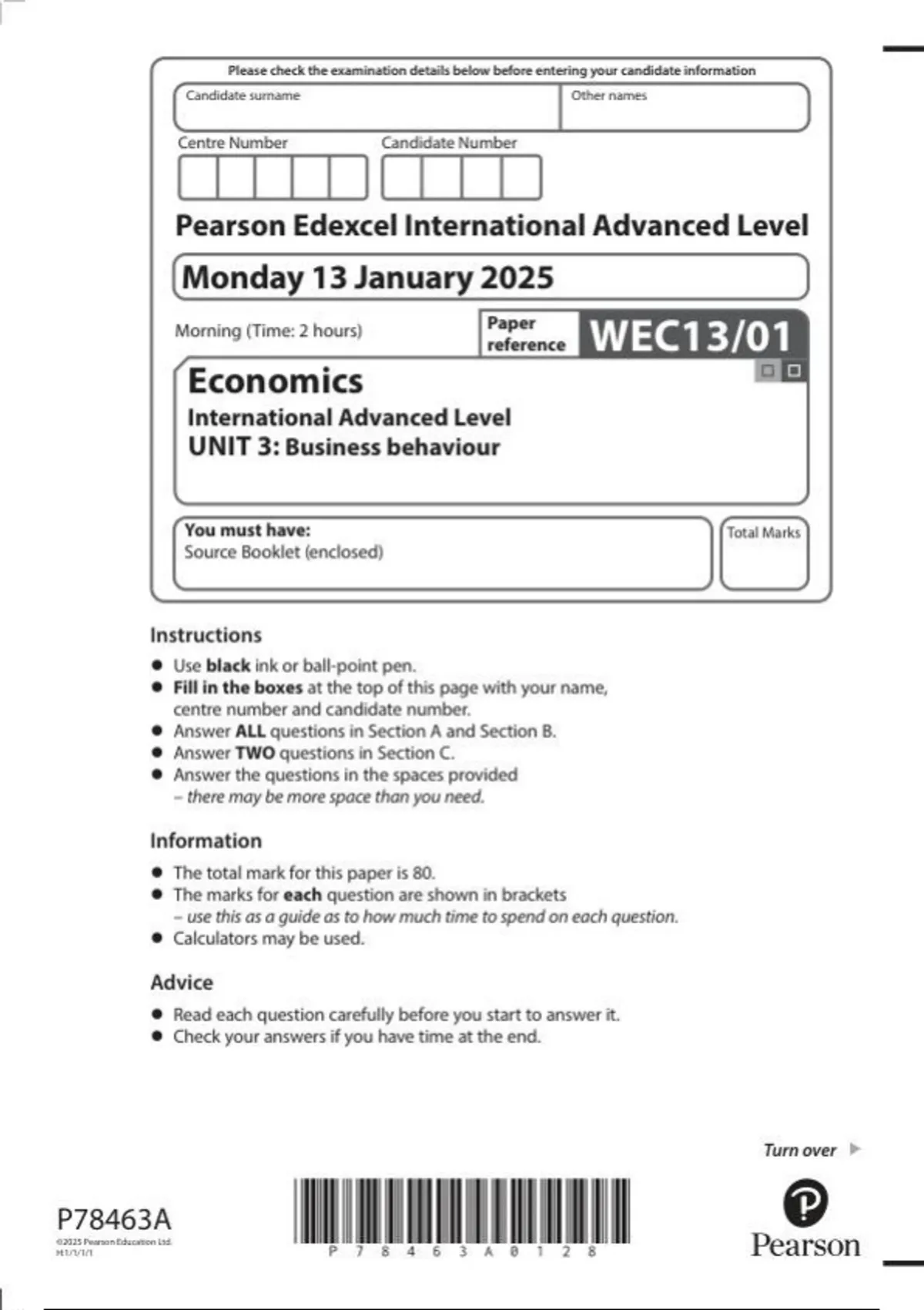 Pearson Edexcel IAL in Economics (WEC13)UNIT 3 JANUARY 2025 OFFICIAL QUESTION PAPER- Business behaviour THIS IS THE OFFICIAL DOCUMENT