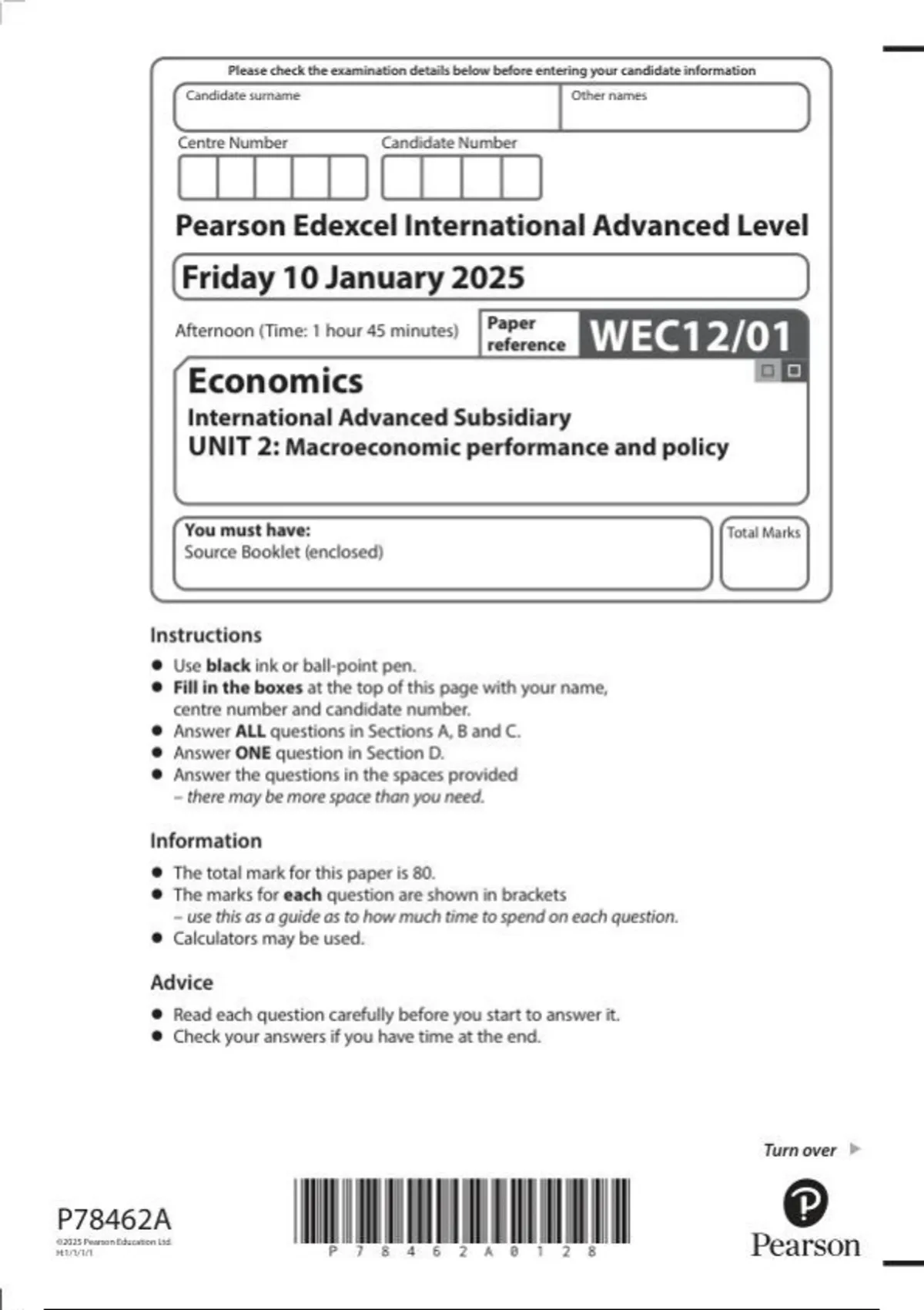 Pearson Edexcel IAL in Economics (WEC12)UNIT 2 JANUARY 2025 OFFICIAL QUESTION PAPER- Macroeconomic performance and policy THIS IS THE OFFICIAL DOCUMENT