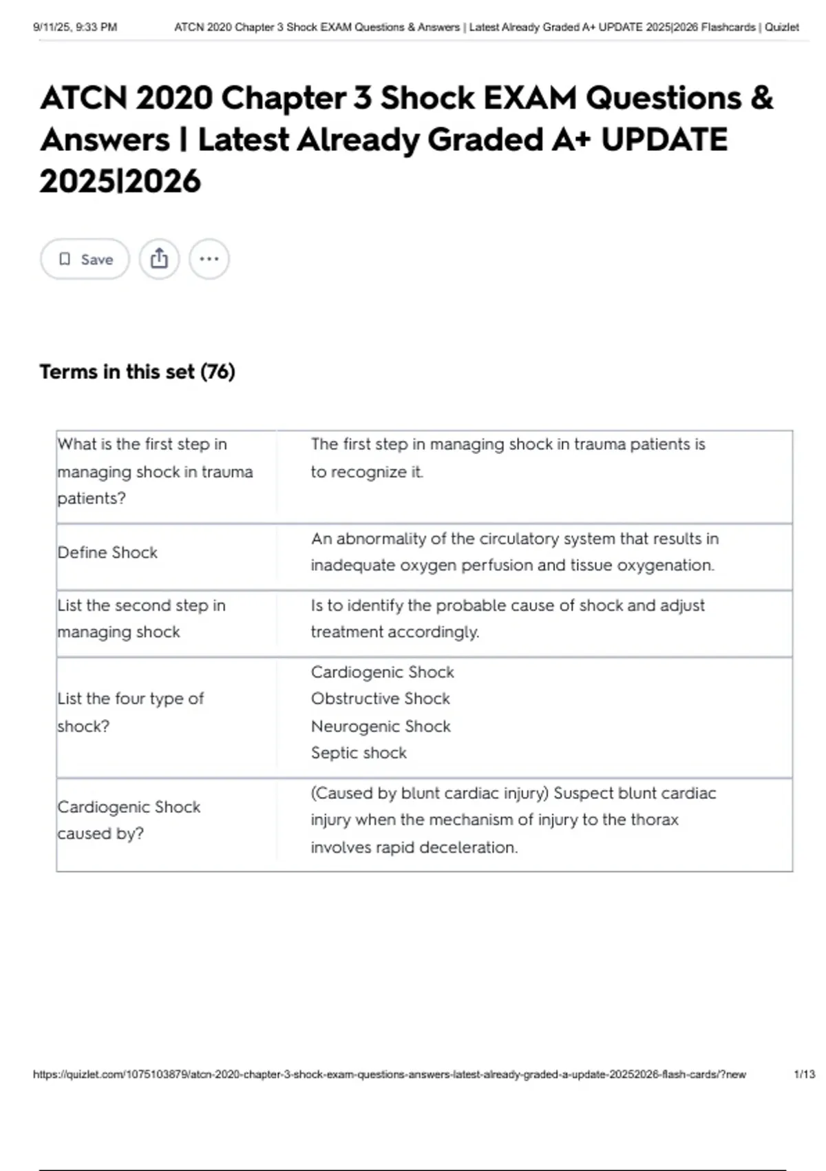 , 9/11/25, 9:33 PM ATCN 2020 Chapter 3 Shock EXAM Questions & Answers | Latest Already Graded A+ UPDATE 2025|2026 Flashcards | Quizlet