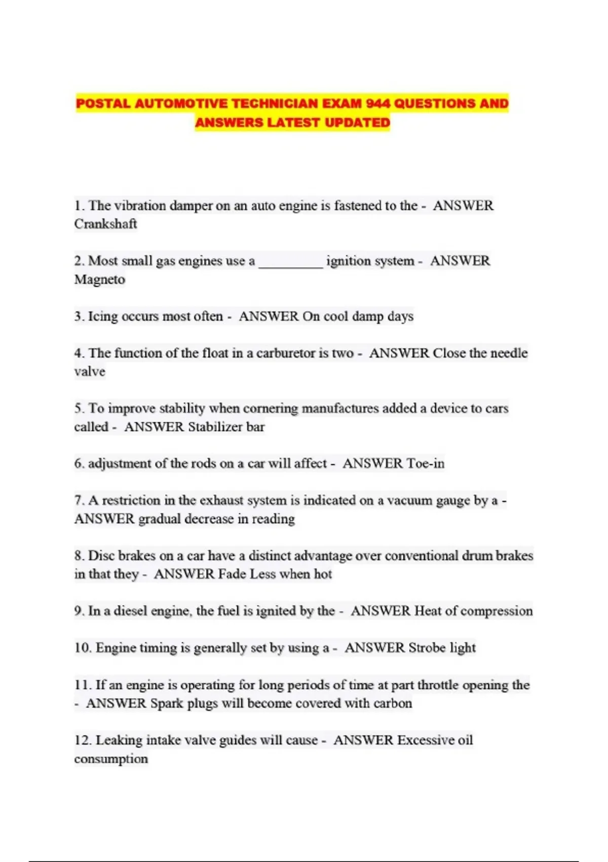 POSTAL AUTOMOTIVE TECHNICIAN EXAM 944 QUESTIONS AND ANSWERS LATEST UPDATED