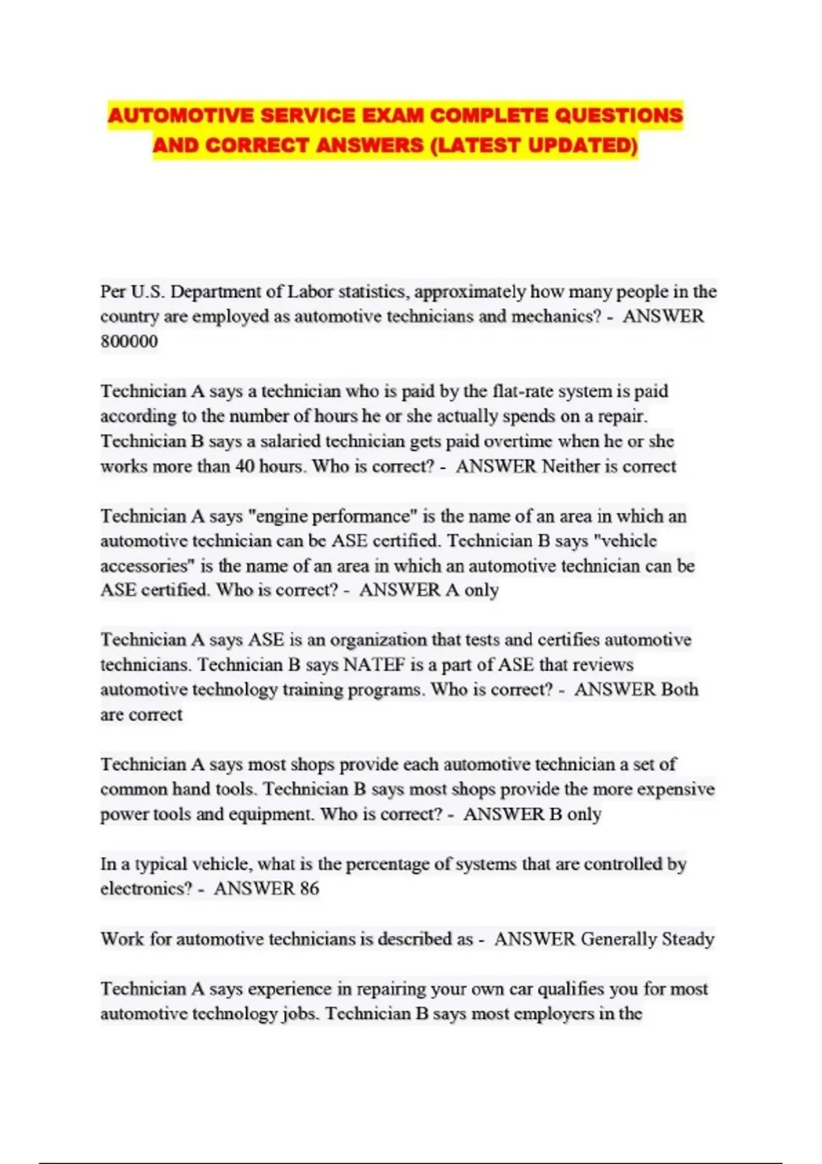 AUTOMOTIVE SERVICE EXAM COMPLETE QUESTIONS AND CORRECT ANSWERS (LATEST UPDATED)....
