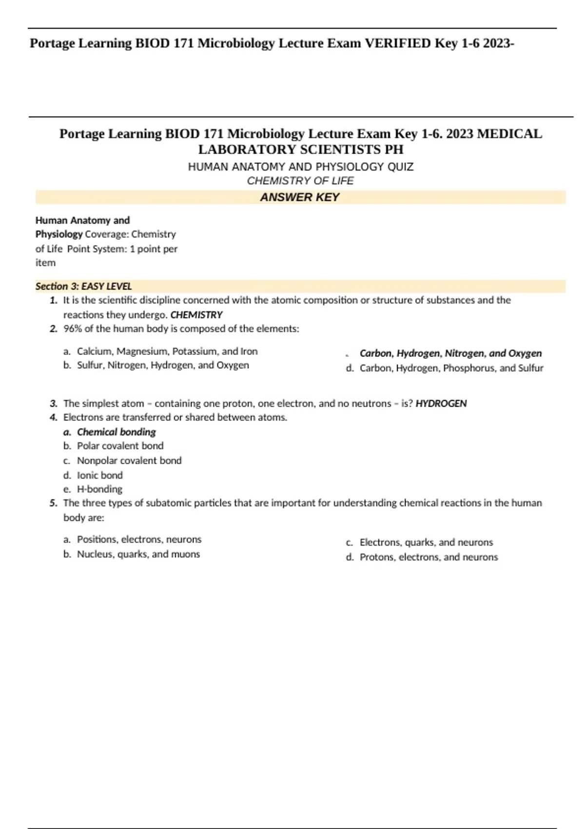 Portage Learning BIOD 171 Microbiology Lecture Exam Key 1-6. 2023 MEDICAL