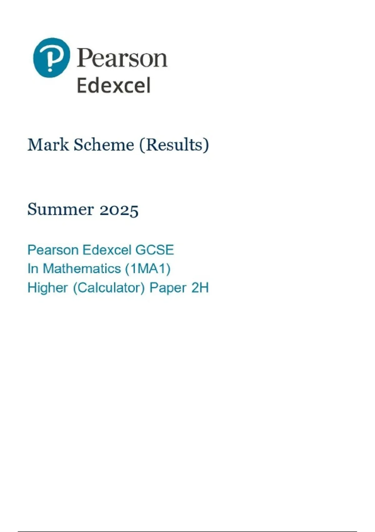 GCSE EDEXCEL MATHEMATICS PAPER 2H (CALCULATOR) SUMMER 2025 MARK SCHEME (1MA1/2H)
