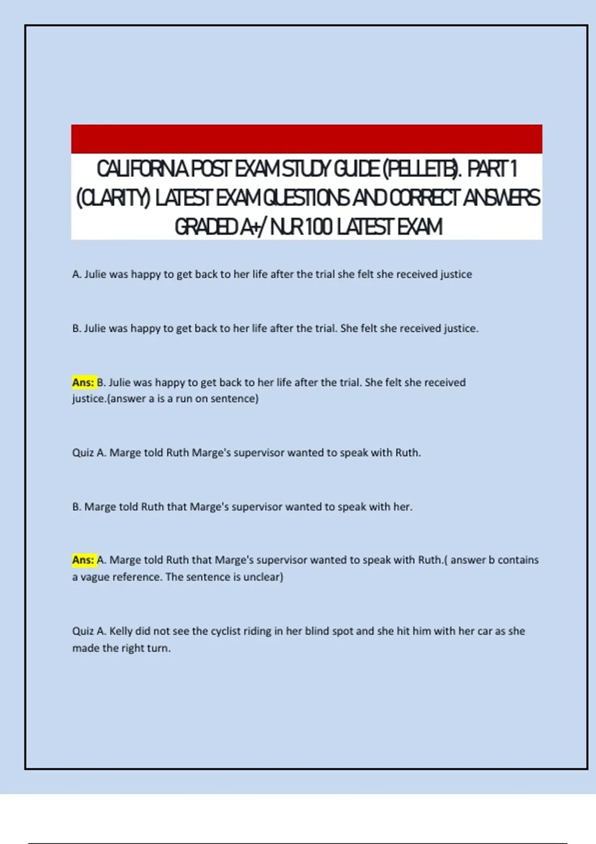 CALIFORNIA POST EXAM STUDY GUIDE (PELLETB). PART 1 (CLARITY) LATEST EXAM QUESTIONS AND CORRECT ANSWERS GRADED A+/ NUR 100 LATEST EXAM
