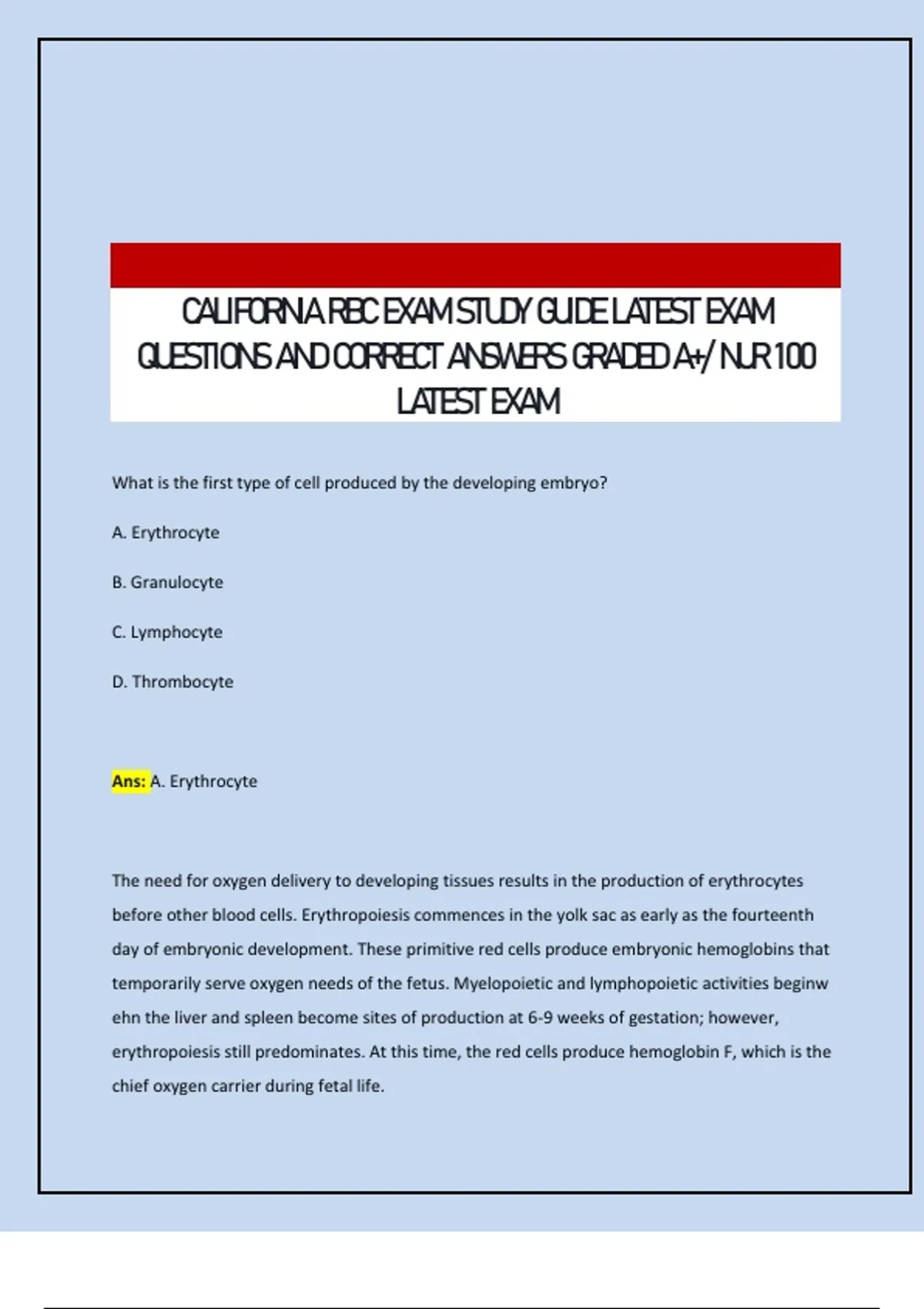 CALIFORNIA RBC EXAM STUDY GUIDE LATEST EXAM QUESTIONS AND CORRECT ANSWERS GRADED A+/ NUR 100 LATEST EXAM