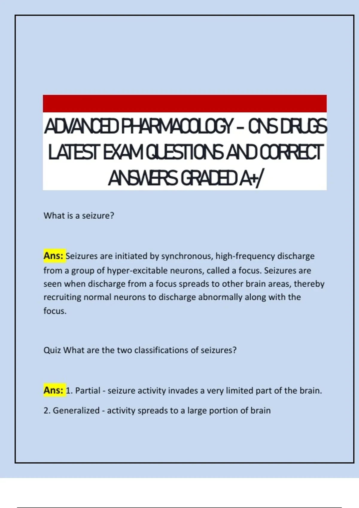 ADVANCED PHARMACOLOGY - CNS DRUGS LATEST EXAM QUESTIONS AND CORRECT ANSWERS GRADED A+/