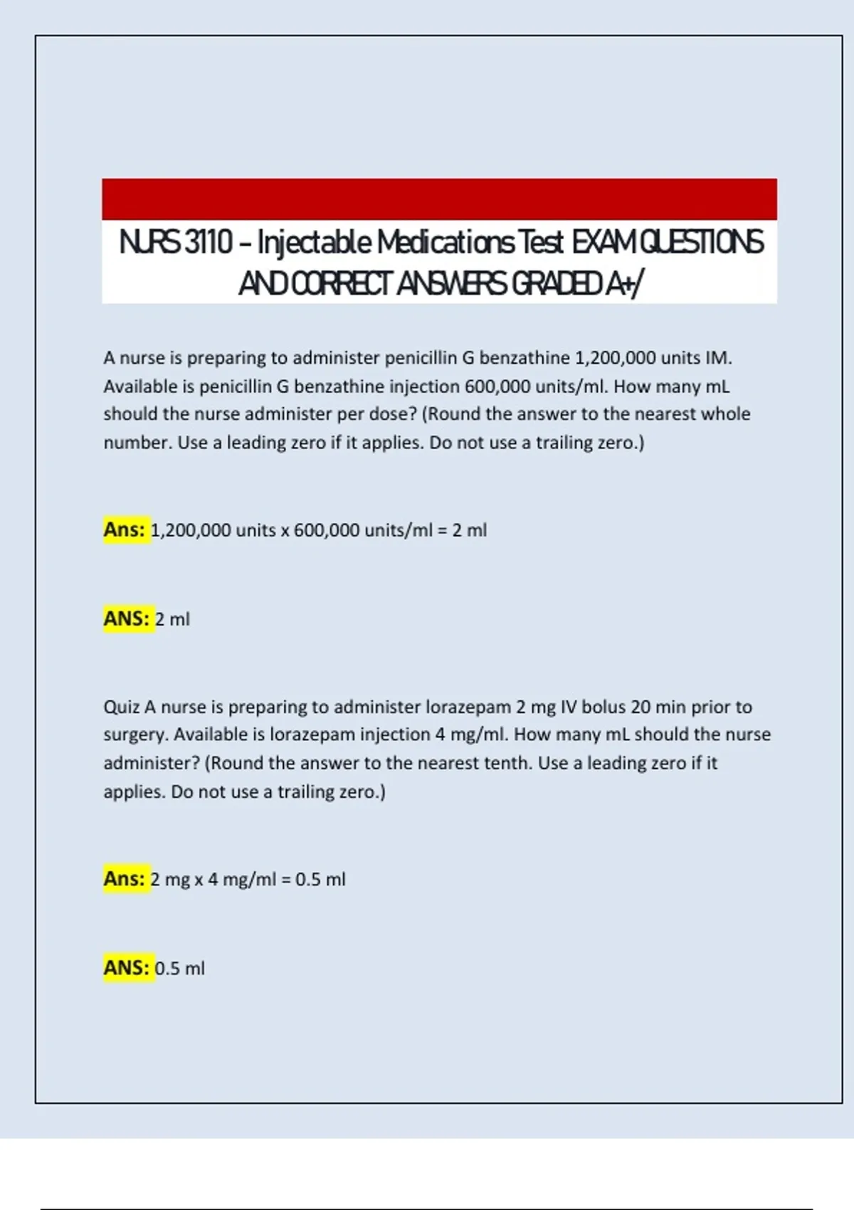 NURS 3110 - Injectable Medications Test EXAM QUESTIONS AND CORRECT ANSWERS GRADED A+/