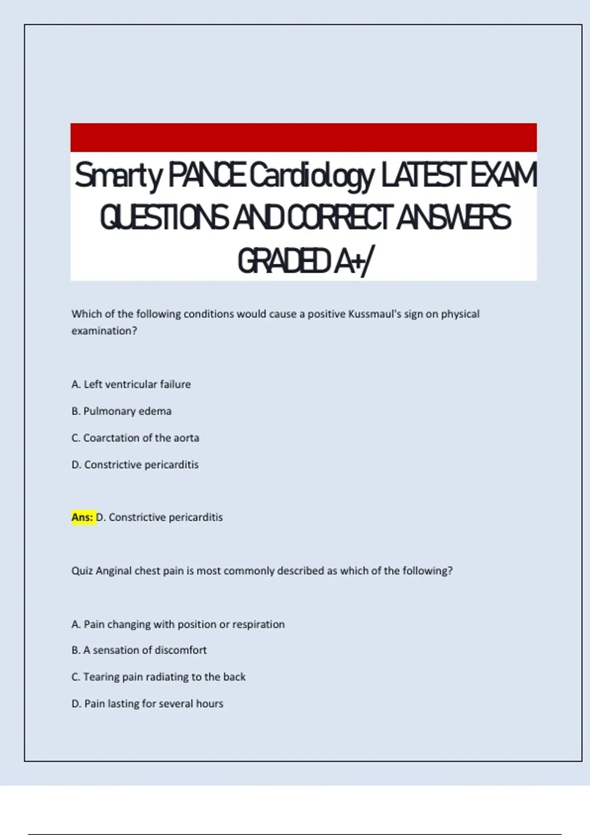Smarty PANCE Cardiology LATEST EXAM QUESTIONS AND CORRECT ANSWERS GRADED A+/