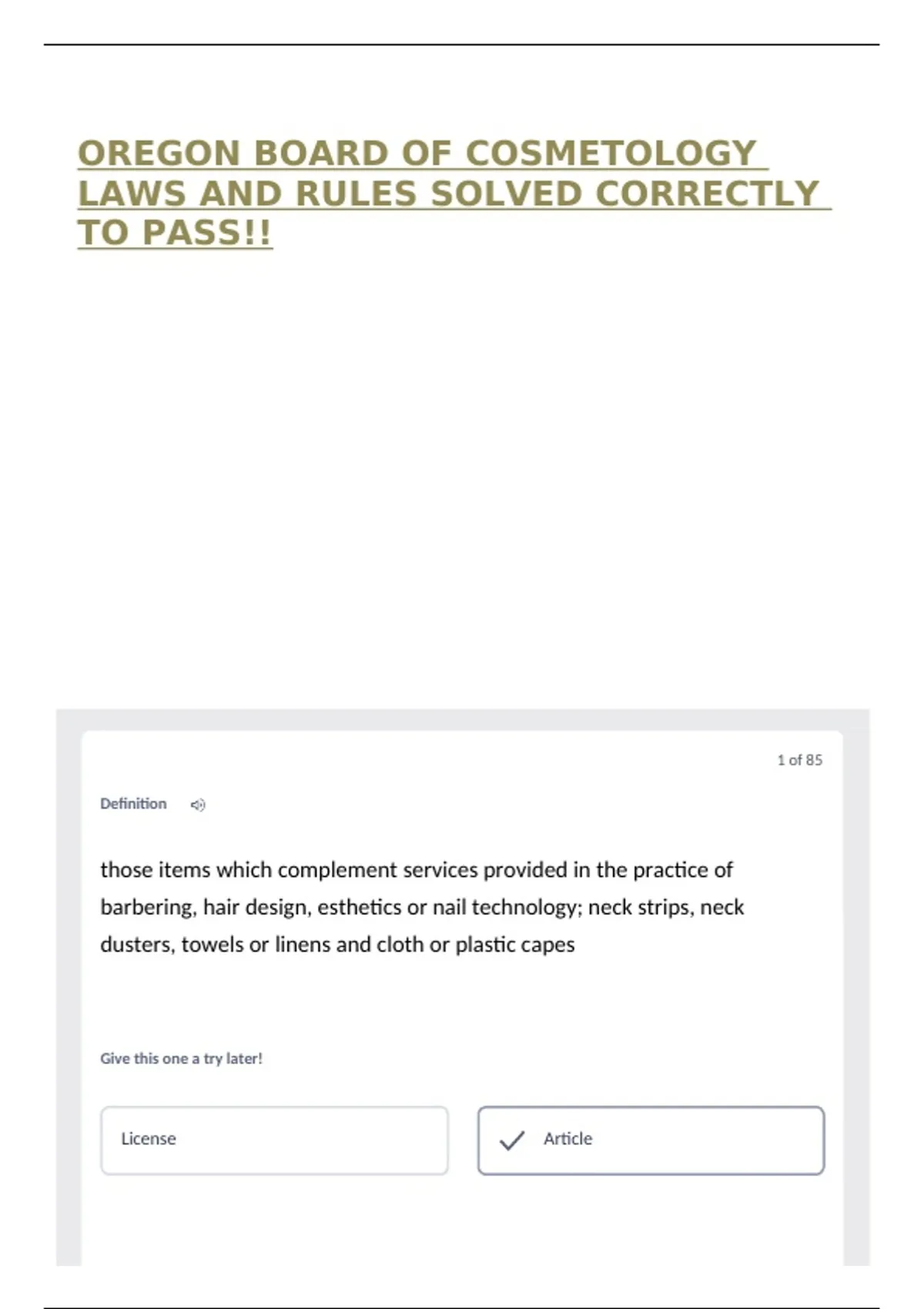 OREGON BOARD OF COSMETOLOGY LAWS AND RULES SOLVED CORRECTLY TO PASS!!