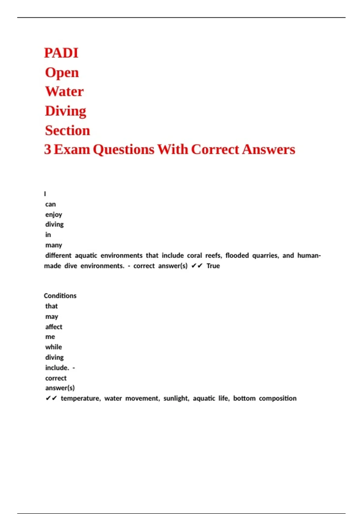 PADI Open Water Diving Section 3 Exam Questions With Correct Answers