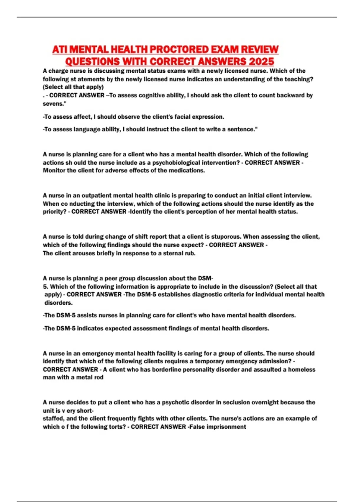 ATI MENTAL HEALTH PROCTORED EXAM REVIEW QUESTIONS WITH CORRECT ANSWERS 2025