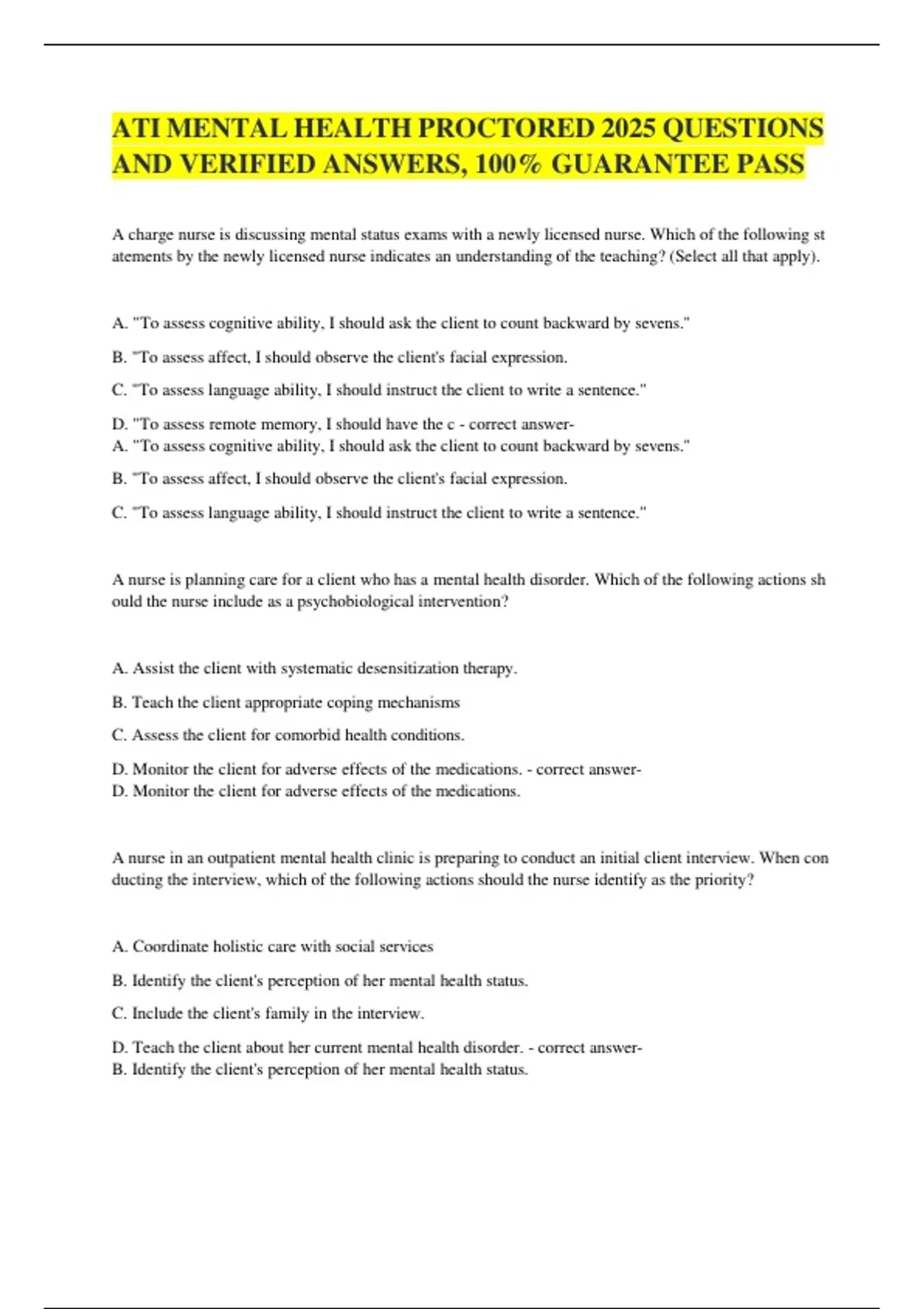ATI MENTAL HEALTH PROCTORED 2025 QUESTIONS AND VERIFIED ANSWERS, 100% GUARANTEE PASS