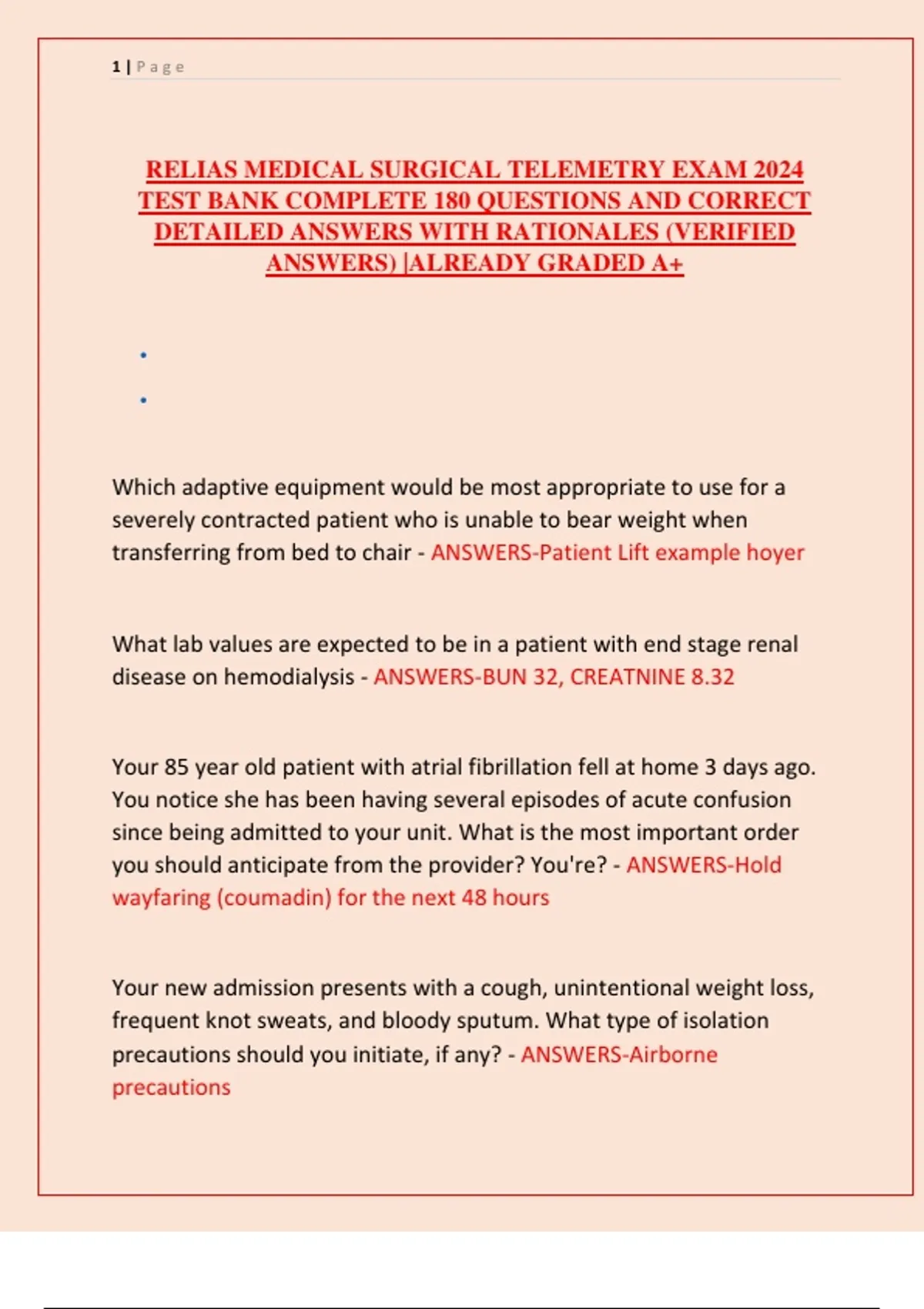 RELIAS MEDICAL SURGICAL TELEMETRY EXAM 2024 TEST BANK COMPLETE 180 QUESTIONS AND CORRECT DETAILED ANSWERS WITH RATIONALES,,