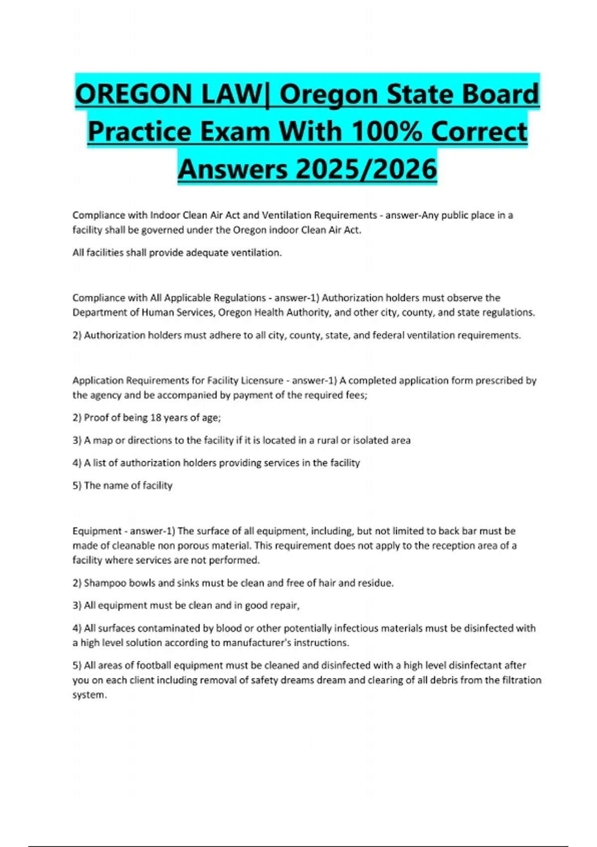 OREGON LAW| Oregon State Board Practice Exam With 100% Correct Answers 2025/2026 Compliance with Indoor Clean Air Act and Ventilation Requirements - answer-Any public place in a facility shall be governed under the Oregon indoor Clean Air Act. All facilities shall provide adequate ventilation. Compliance with All Applicable Regulations - answer-1) Authorization holders must observe the Department of Human Services, Oregon Health Authority, and other city, county, and state regulations. 2) Authorization holders must adhere to all city, county, state, and federal ventilation requirements. Application Requirements for Facility Licensure - answer-1) A completed application form prescribed by the agency and be accompanied by payment of the required fees; 2) Proof of being 18 years of age; 3) A map or directions to the facility if it is located in a rural or isolated area 4) A list of authorization holders providing services in the facility 5) The name of facility Equipment - answer-1) The surface of all equipment, including, but not limited to back bar must be made of cleanable non porous material. This requirement does not apply to the reception area of a facility where services are not performed. 2) Shampoo bowls and sinks must be clean and free of hair and residue. 3) All equipment must be clean and in good repair, 4) All surfaces contaminated by blood or other potentially infectious materials must be disinfected with a high level solution according to manufacturer's instructions. 5) All areas of football equipment must be cleaned and disinfected with a high level disinfectant after you on each client including removal of safety dreams dream and clearing of all debris from the filtration system.