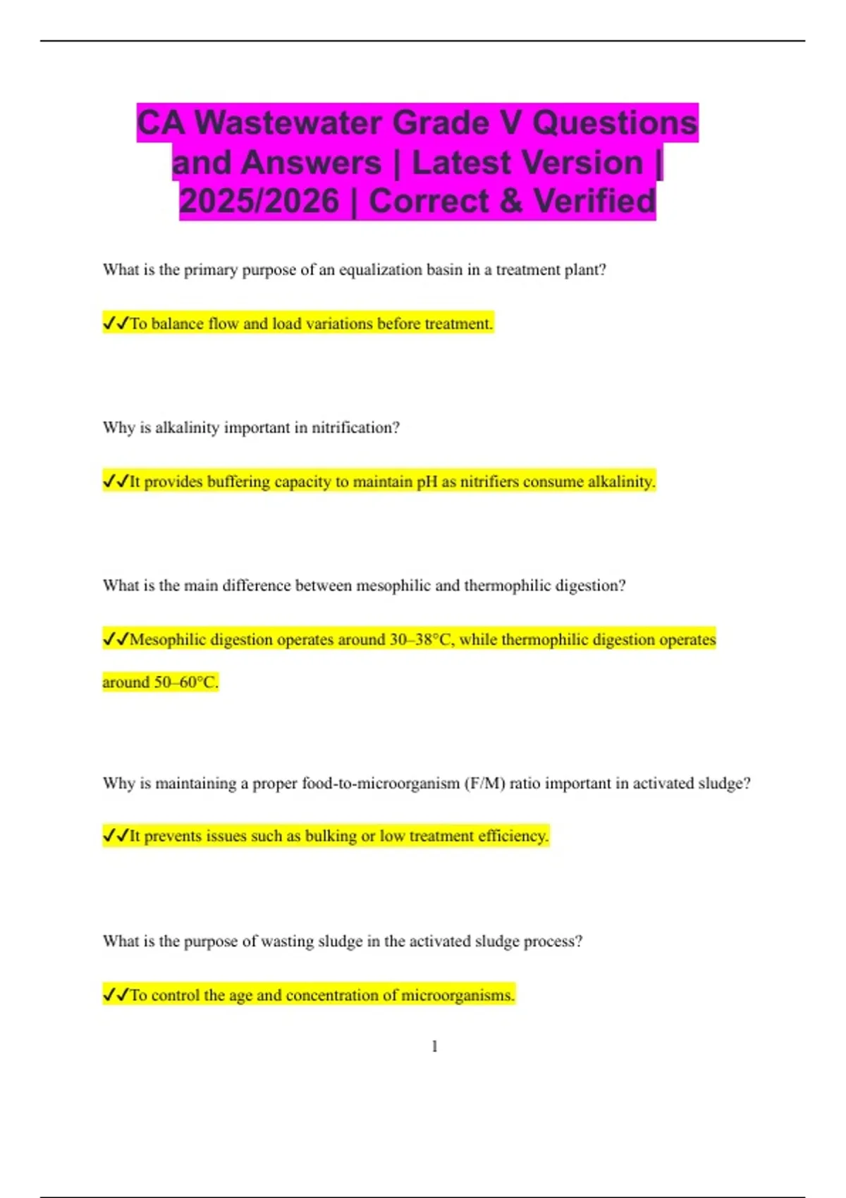 CA Wastewater Grade V Questions and Answers | Latest Version | 2025/2026 | Correct & Verified What is the primary purpose of an equalization basin in a treatment plant? To balance flow and load variations before treatment. Why is alkalinity important in nitrification? It provides buffering capacity to maintain pH as nitrifiers consume alkalinity. What is the main difference between mesophilic and thermophilic digestion? Mesophilic digestion operates around 30–38°C, while thermophilic digestion operates around 50–60°C. Why is maintaining a proper food-to-microorganism (F/M) ratio important in activated sludge? It prevents issues such as bulking or low treatment efficiency. What is the purpose of wasting sludge in the activated sludge process? To control the age and concentration of microorganisms. 2 Why must dissolved oxygen levels be maintained in aeration basins? To support aerobic microbial activity for organic matter removal. What causes rising sludge in secondary clarifiers? Denitrification producing nitrogen gas bubbles that float solids. Why is chlorine demand higher in wastewater than in drinking water? Because wastewater contains more organic and inorganic compounds that consume chlorine. What is the purpose of secondary clarifiers in activated sludge systems? To settle biological solids and return or waste them. Why is pH control important during chemical phosphorus removal? Because chemical precipitation reactions are pH-dependent. What is the main advantage of using ultraviolet disinfection instead of chlorine? It kills pathogens without producing harmful disinfection by-products. 3 What type of bacteria perform nitrification? Autotrophic aerobic bacteria such as Nitrosomonas and Nitrobacter. What is the end product of denitrification? Nitrogen gas released to the atmosphere. Why is sludge thickening performed before dewatering? To reduce water content and improve dewatering efficiency. What is the purpose of a digester gas flare system? To safely burn excess methane gas. Why must hydrogen sulfide be controlled in wastewater systems? It causes odor, corrosion, and safety hazards. What is the purpose of using coagulants in wastewater treatment? To destabilize and remove colloidal particles. 4 What is the relationship between SVI and sludge settleability? A low SVI indicates good settling, while