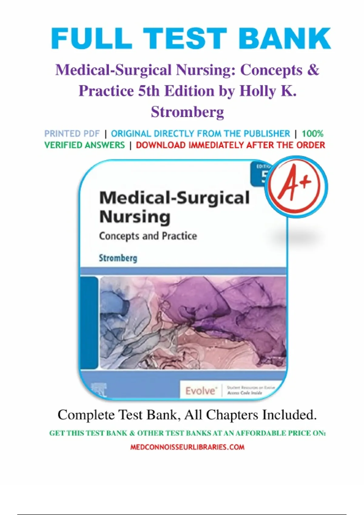 Test Bank For Medical Surgical Nursing 5th Edition By Holly K. Stromberg Chapter 1-49 | Latest Guide 2023 ISBN-13: 0210 Unit I. Medical-Surgical Nursing Settings 1. Caring for Medical-Surgical Patients Caring for Medical-Surgical Patients Roles of the LPN/LVN Employment Opportunities Ethical and Legal Practice Quality and Safety Health Care Today Financing of Health Care Providing Holistic Care 2. Critical Thinking, Clinical Judgment, and the Nursing Process Critical Thinking and Clinical Judgment Applying LPN/LVN Standards in Medical-Surgical Nursing Interdisciplinary (Collaborative) Care Plans Unit II. Medical-Surgical Patient Care Problems 3. Fluids, Electrolytes, Acid-Base Balance, and Intravenous Therapy Distribution and Regulation of Body Fluids Osmolality Fluid Imbalances Electrolytes Acid-Base System Acid-Base Imbalances Intravenous Fluid Therapy Nursing Management Community Care 4. Care of Preoperative and Intraoperative Surgical Patients Surgery Technological Approaches in Surgery Autologous Blood for Transfusion Bloodless Surgery Perioperative Nursing Management The Surgical Team The Surgical Suite Anesthesia Potential Intraoperative Complications 5. Care of Postoperative Surgical Patients Immediate Postoperative Care Nursing Management Discharge Planning Community Care 6. Infection Prevention and Control The Infectious Process and Disease The Body’s Defense Against Infection Infection Prevention and Control Health Care–Associated Infections Multidrug-Resistant Organisms (MDROs) Sepsis and Septic Shock Nursing Management Community Care 7. Care of Patients With Pain Theories of Pain Classification of Pain Perception of Pain Acute Versus Chronic Pain Nursing Management Management of Pain Community Care 8. Care of Patients With Cancer The Impact of Cancer Pathophysiology of Cancer Metastasis Genetic Factors Contributing Factors Classification of Tumors Measures to Prevent Cancer Detection of Cancer Nursing Management Common Therapies, Problems, and Nursing Care Common Problems Related to Cancer or Cancer Treatment Caring for the Dying Cancer Patient 9. Chronic Illness and Rehabilitation Chronic Illness Rehabilitation Nursing Management Home Care Unit III. Immune System 10. The Immune and Lymphatic Systems Anatomy and Physiology of the Immune and Lymphatic Systems Protective Mechanisms of the Immune and Lymphatic Systems Immune and Lymphatic System Disorders Nursing Management Common Problems Related to the Immune and Lymphatic Systems 11. Care of Patients With Immune and Lymphatic Disorders Immune Function and Dysfunction Immune Deficiency Conditions Therapeutic Immunosuppression Nursing Management Human Immunodeficiency Virus and Acquired Immunodeficiency Syndrome Nursing Management Human Immunodeficiency Virus Risk in Patients Older Than 50 Years Community Education and Care Autoimmune and Autoinflammatory Disorders Disorders of the Lymphatic System Disorders of Inappropriate Immune Response Nursing Management Unit IV. Respiratory System 12. The Respiratory System Overview of Anatomy and Physiology of the Respiratory System Causes of Respiratory Disorders Respiratory Disorders Nursing Management Common Respiratory Patient Care Problems 13. Care of Patients With Disorders of the Upper Respiratory System Disorders of the Nose and Sinuses Obstruction and Trauma Community Care 14. Care of Patients With Disorders of the Lower Respiratory System Respiratory Infectious Diseases Restrictive Pulmonary Disorders Obstructive Pulmonary Disorders Pulmonary Vascular Disorders Chest Injuries Lung Disorders Common Therapeutic Measures Community Care Unit V. Hematologic System 15. The Hematologic System Overview of Anatomy and Physiology of the Hematologic System Causes of Hematologic Disorders Prevention of Hematologic Disorders Diagnostic Tests and Procedures Nursing Management Common Problems Related to Disorders of the Hematologic System 16. Care of Patients With Hematologic Disorders Disorders of the Hematologic System Nursing Management Coagulation Disorders Therapies Frequently Used in the Management of Hematologic Disorders Community Care Unit VI. Cardiovascular System 17. The Cardiovascular System Overview of Anatomy and Physiology of the Cardiovascular System Cardiovascular Disease Nursing Management Evaluation Common Problems of Patients With Cardiovascular Disorders 18. Care of Patients With Hypertension and Peripheral Vascular Disease Hypertension Nursing Management Arteriosclerosis and Atherosclerosis Peripheral Vascular Disease Nursing Management Nursing Management Nursing Management Venous Disorders Nursing Management Nursing Management Community Care 19. Care of Patients With Cardiac Disorders Disorders of the Heart Nursing Management Inflammatory and Infectious Diseases of the Heart Cardiomyopathy Cardiac Valve Disorders Common Therapies and Their Nursing Implications Community Care 20. Care of Patients With Coronary Artery Disease and Cardiac Surgery Coronary Artery Disease Surgical and Nonsurgical Treatment Options Community Care Unit VII. Neurologic System 21. The Neurologic System Anatomy and Physiology Of The Neurologic System Causative Factors Involved in Neurologic Disorders Prevention of Neurologic Disorders Evaluation of Neurologic Status Nursing Management Common Neurologic Patient Care Problems 22. Care of Patients With Head and Spinal Cord Injuries Traumatic Brain (Head) Injuries Increased Intracranial Pressure Nursing Management Injuries of the Spine and Spinal Cord Nursing Management Back Pain and Herniated Disk (Bulged, Slipped, or Ruptured Disk) 23. Care of Patients With Brain Disorders Seizure Disorders and Epilepsy Nursing Management Transient Ischemic Attack Cerebrovascular Accident (Stroke, Brain Attack) Nursing Management Brain Tumor Nursing Management Infectious and Inflammatory Disorders of the Nervous System Nursing Management Headaches Cranial nerve disorders Nursing Management 24. Care of Patients With Peripheral Nerve and Degenerative Neurologic 