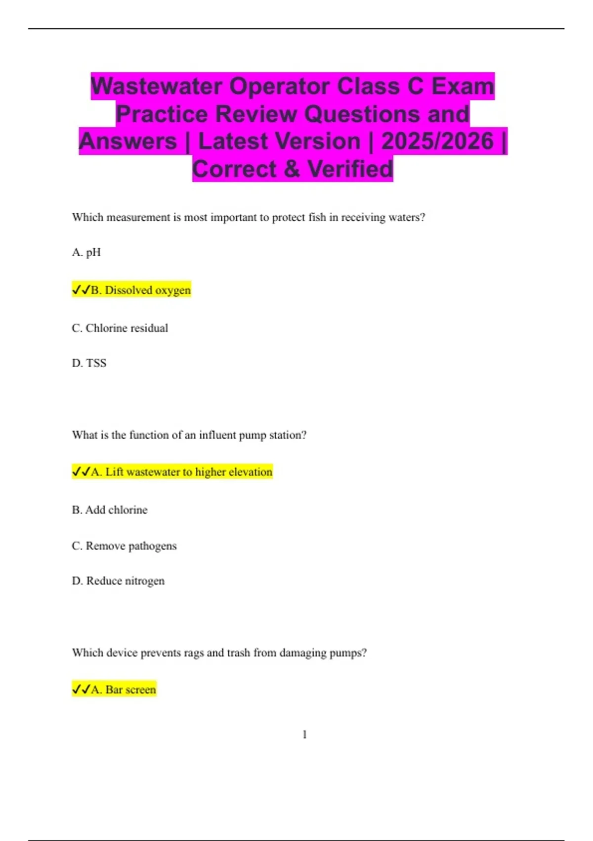 Wastewater Operator Class C Exam Practice Review Questions and Answers | Latest Version | 2025/2026 | Correct & Verified Which measurement is most important to protect fish in receiving waters? A. pH B. Dissolved oxygen C. Chlorine residual D. TSS What is the function of an influent pump station? A. Lift wastewater to higher elevation B. Add chlorine C. Remove pathogens D. Reduce nitrogen Which device prevents rags and trash from damaging pumps? A. Bar screen 2 B. Grit chamber C. Primary clarifier D. Aeration tank What is the main purpose of primary treatment? A. Destroy pathogens B. Settle solids and floatables C. Supply oxygen D. Remove chlorine Which test measures the amount of biodegradable organic matter? A. BOD test B. TSS test C. Alkalinity test D. Hardness test What happens if sludge is not removed from a clarifier? A. Solids wash out into effluent 3 B. pH increases C. Chlorine demand drops D. Flow decreases Which type of bacteria carry out nitrification? A. Anaerobic bacteria B. Nitrifying bacteria C. Sulfate-reducing bacteria D. Fermenting bacteria What is the most common safety hazard with chlorine gas? A. Respiratory damage B. Explosion risk C. Electrical shock D. Heat burns Why is dissolved oxygen important in activated sludge? A. Neutralizes alkalinity 4 B. Supports microorganism respiration C. Removes grit D. Reduces chlorine What is the primary purpose of secondary treatment? A. Biologically remove organic matter B. Filter heavy metals C. Increase alkalinity D. Add grit What is the typical detention time for an aeration basin? A. 10–20 minutes B. 4–8 hours C. 24–36 hours D. 72 hours What is the purpose of secondary clarifiers? A. Settle biological solids 5 B. Add oxygen