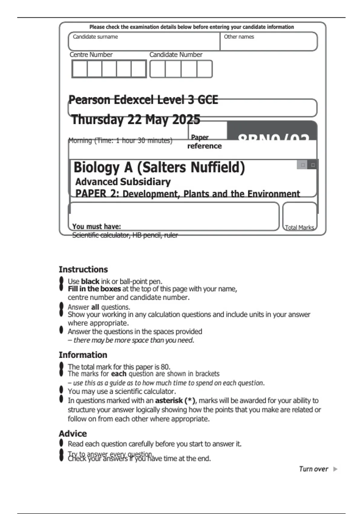 Pearson Edexcel Level 3 GCE 8BN0/02 Advanced Subsidiary PAPER 2: Development, Plants and the Environment June 2025