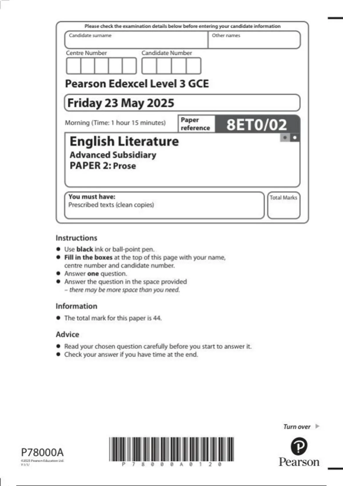 Pearson Edexcel Level 3 GCE 8ET0/02 English Literature Advanced Subsidiary PAPER 2: Prose Question paper June 2025