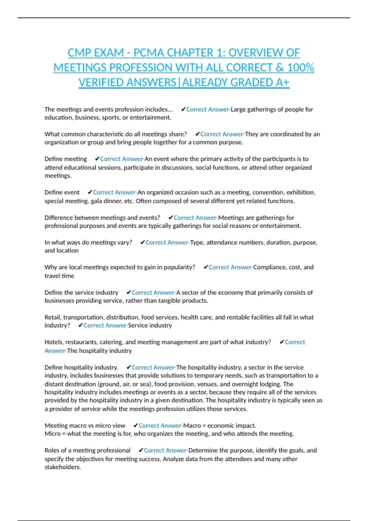 CMP EXAM - PCMA CHAPTER 1: OVERVIEW OF MEETINGS PROFESSION WITH ALL CORRECT & 100% VERIFIED ANSWERS|ALREADY GRADED A+
