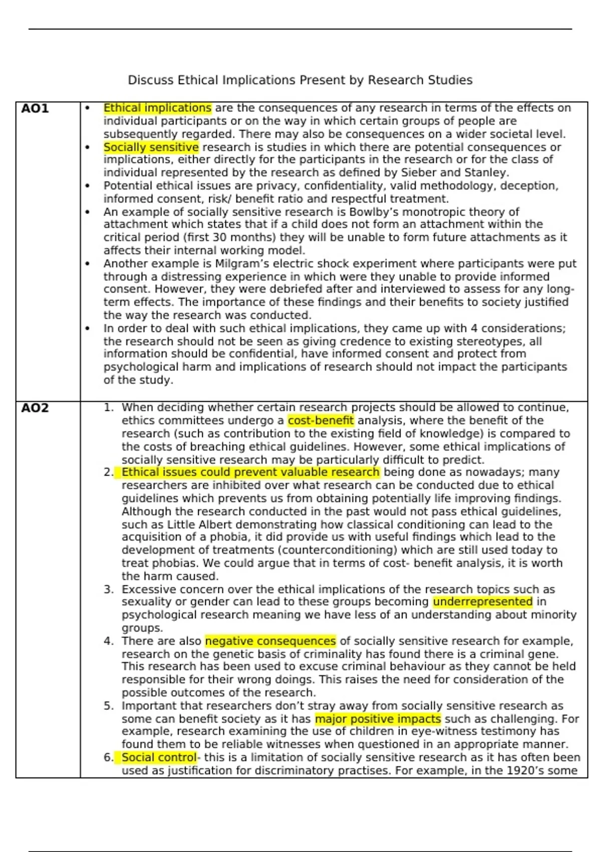 AO1 Ethical implications are the consequences of any research in terms of the effects on