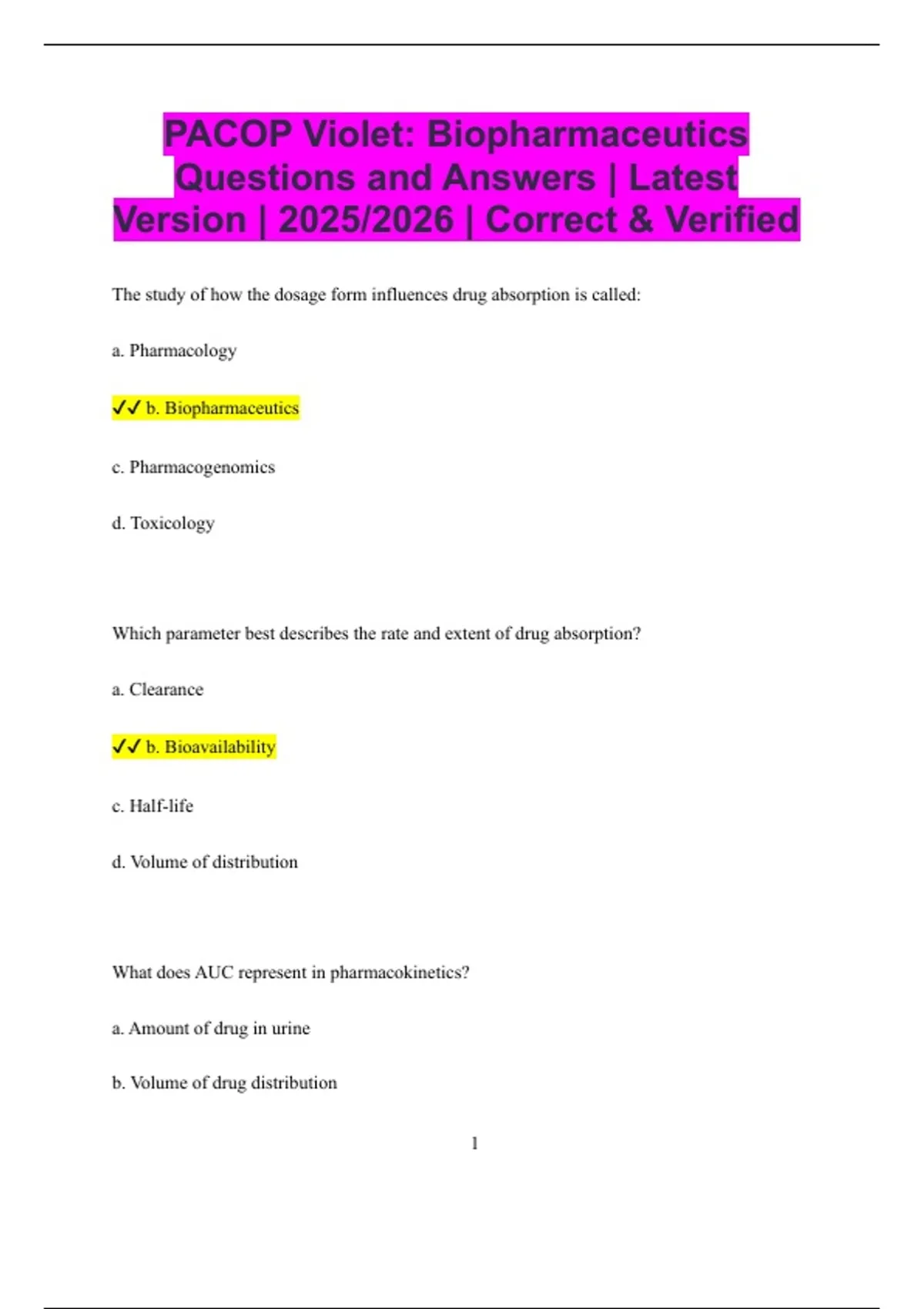 PACOP Violet: Biopharmaceutics Questions and Answers | Latest Version | 2025/2026 | Correct & Verified