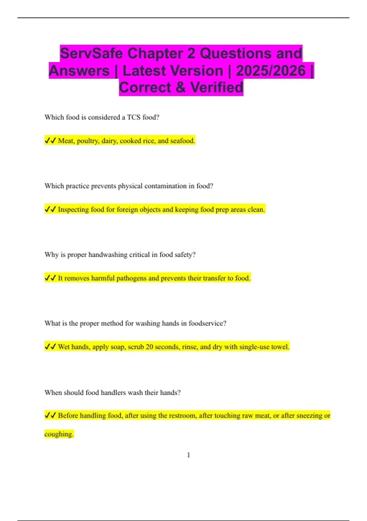 ServSafe Chapter 2 Questions and Answers | Latest Version | 2025/2026 | Correct & Verified Which food is considered a TCS food? Meat, poultry, dairy, cooked rice, and seafood. Which practice prevents physical contamination in food? Inspecting food for foreign objects and keeping food prep areas clean. Why is proper handwashing critical in food safety? It removes harmful pathogens and prevents their transfer to food. What is the proper method for washing hands in foodservice? Wet hands, apply soap, scrub 20 seconds, rinse, and dry with single-use towel. When should food handlers wash their hands? Before handling food, after using the restroom, after touching raw meat, or after sneezing or coughing. 2 Which foodborne illness is linked to improperly canned foods? Botulism caused by Clostridium botulinum. Which pathogen grows in cooked rice left at room temperature? Bacillus cereus. What is the danger zone for bacterial growth in food? 41°F to 135°F (5°C to 57°C). What is the maximum time TCS foods can remain in the danger zone? 4 hours. Which bacteria can cause rapid-onset vomiting after eating contaminated food? Staphylococcus aureus. Which type of contamination involves harmful bacteria, viruses, or parasites? Biological contamination. 3 Which type of contamination occurs from chemicals like cleaners or pesticides? Chemical contamination. What type of contamination involves foreign objects like hair, glass, or metal? Physical contamination. What is the most common cause of foodborne illness in foodservice operations? Biological contamination from pathogens. Which group of people is at higher risk for foodborne illness? Young children, elderly, pregnant women, and immunocompromised individuals. What is the main source of Norovirus outbreaks in restaurants? Contaminated food handled by infected food workers. Which bacteria is commonly linked to raw poultry and eggs? Salmonella spp. 4 Which pathogen can grow at refrigeration temperatures and is dangerous for pregnant women? Listeria monocytogenes.
