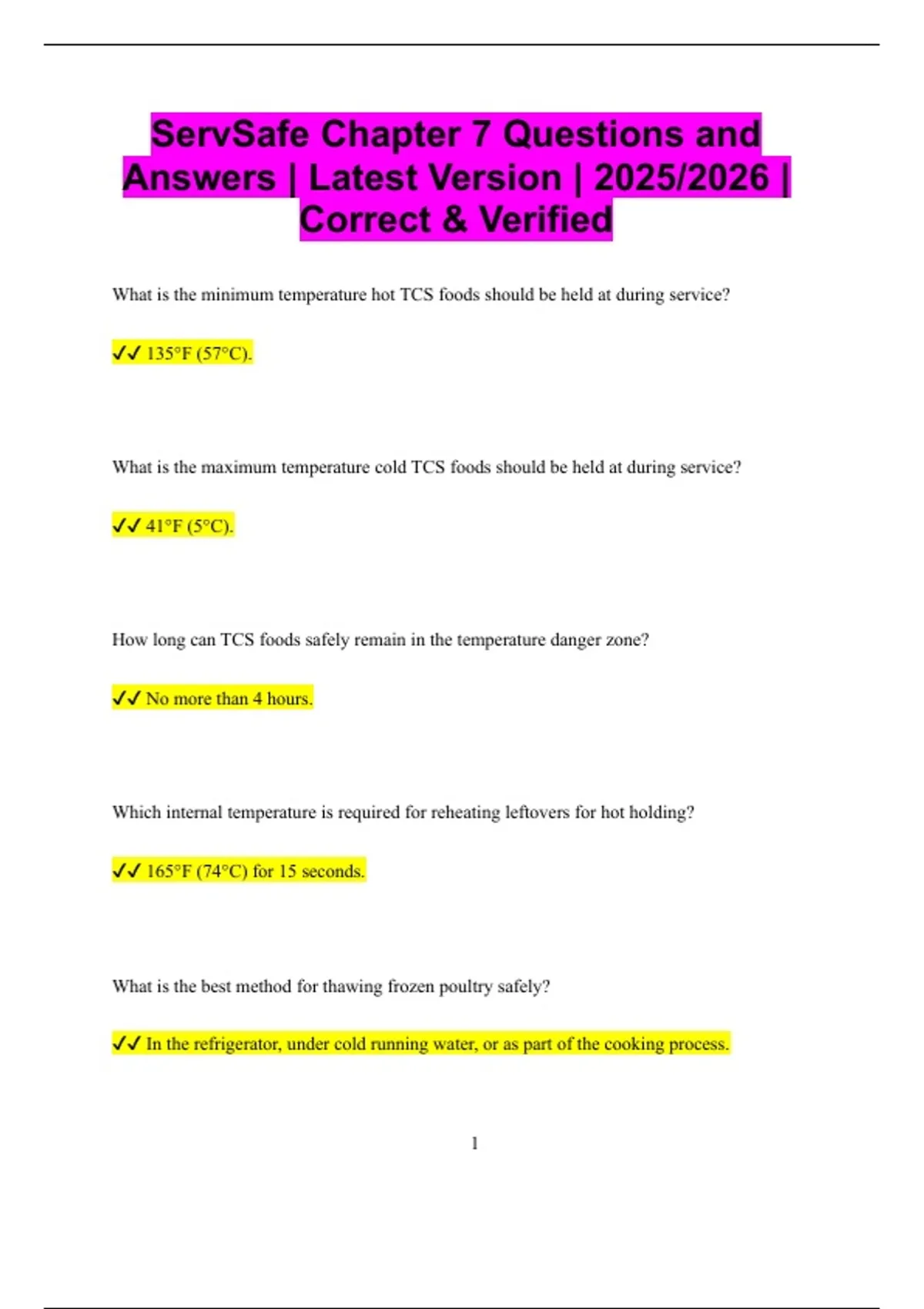ServSafe Chapter 7 Questions and Answers | Latest Version | 2025/2026 | Correct & Verified What is the minimum temperature hot TCS foods should be held at during service? 135°F (57°C). What is the maximum temperature cold TCS foods should be held at during service? 41°F (5°C). How long can TCS foods safely remain in the temperature danger zone? No more than 4 hours. Which internal temperature is required for reheating leftovers for hot holding? 165°F (74°C) for 15 seconds. What is the best method for thawing frozen poultry safely? In the refrigerator, under cold running water, or as part of the cooking process. 2 Which procedure is recommended for cooling large batches of soup safely? Divide into smaller portions and place in shallow containers. What is the proper way to check the internal temperature of thick foods? Use a calibrated food thermometer inserted into the thickest part of the food. What is the minimum internal temperature for cooking poultry to ensure it is safe to eat? 165°F (74°C) for 15 seconds. At what temperature should ground beef be cooked to ensure safety? 155°F (68°C) for 15 seconds. Which internal temperature must seafood reach to be safely cooked? 145°F (63°C) for 15 seconds. What is the required internal temperature for cooking pork chops? 145°F (63°C) with a 3-minute rest time. 3 Which temperature range is considered the danger zone for bacterial growth? 41°F to 135°F (5°C to 57°C). Which internal temperature is required for cooking eggs for immediate service? 145°F (63°C) for 15 seconds. Which internal temperature is required for cooking eggs that will be held for later service? 155°F (68°C) for 15 seconds. How should stuffed meat or poultry be cooked to ensure safety? Cook to an internal temperature of 165°F (74°C). Which internal temperature is recommended for cooking roasts of beef, pork, or lamb? 145°F (63°C) with a 3-minute rest time. What is the proper way to check the temperature of thin foods like fish fillets? Use a thermocouple with a thin probe. 4 What is the proper method for cooling TCS