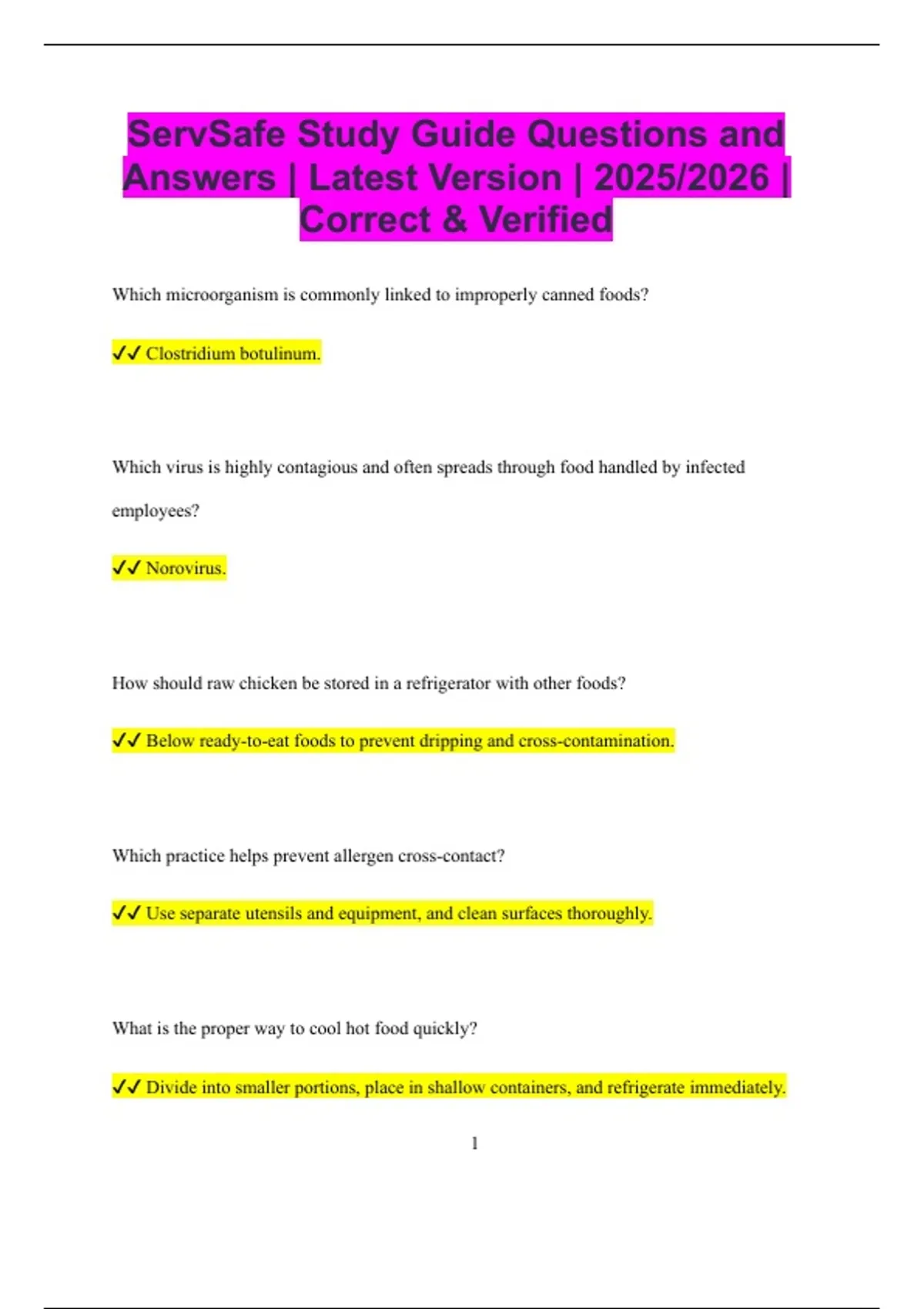 ServSafe Study Guide Questions and Answers | Latest Version | 2025/2026 | Correct & Verified Which microorganism is commonly linked to improperly canned foods? Clostridium botulinum. Which virus is highly contagious and often spreads through food handled by infected employees? Norovirus. How should raw chicken be stored in a refrigerator with other foods? Below ready-to-eat foods to prevent dripping and cross-contamination. Which practice helps prevent allergen cross-contact? Use separate utensils and equipment, and clean surfaces thoroughly. What is the proper way to cool hot food quickly? Divide into smaller portions, place in shallow containers, and refrigerate immediately. 2 Which chemical hazard can contaminate food? Cleaning agents, pesticides, or improperly stored chemicals. What is the proper way to store chemicals in a kitchen? Separately from food, in labeled containers, and in designated areas. What is the proper way to wash hands in a foodservice environment? Wet hands with warm water, apply soap, scrub for at least 20 seconds, rinse, and dry with a single-use towel. Which temperature range is considered the danger zone for bacterial growth in food? 41°F to 135°F (5°C to 57°C). What is the minimum internal cooking temperature for poultry to ensure safety? 165°F (74°C). How long can perishable food safely remain at room temperature? 3 No more than 2 hours, or 1 hour if the temperature is above 90°F (32°C). What is cross-contamination? The transfer of harmful microorganisms from one food or surface to another. Which foods are considered TCS (Time/Temperature Control for Safety) foods? Meat, poultry, seafood, dairy, cooked rice, and cut fruits and vegetables. What is the minimum internal temperature for ground beef? 155°F (68°C) for 15 seconds. How should leftovers be stored to ensure safety? Cool quickly, store in shallow containers, and label with the date. What is the proper temperature for holding hot food? 135°F (57°C) or higher. What is the correct temperature for holding cold food? 4 41°F (5°C) or lower. Which pathogen is commonly associated with raw or undercooked eggs? Salmonella Enteritidis. What is the proper procedure for thawing frozen food safely? In the refrigerator, under cold running water, in a microwave if cooking immediately, or during the cooking process. Which foods require the most careful handling to prevent bacterial growth? TCS foods such as dairy, meat, poultry, seafood,