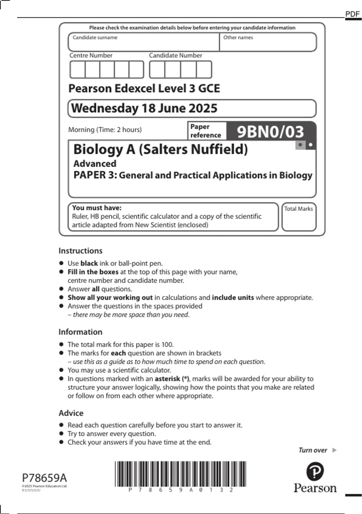 [Verified] June 2025 Edexcel A-Level Biology A Past Paper 3 [9BN0/03]