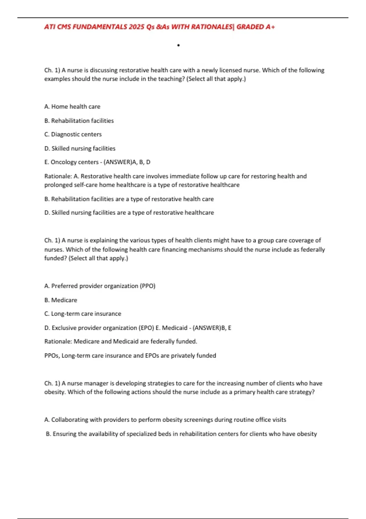 , ATI CMS FUNDAMENTALS 2025 Qs &As WITH RATIONALES| GRADED A+