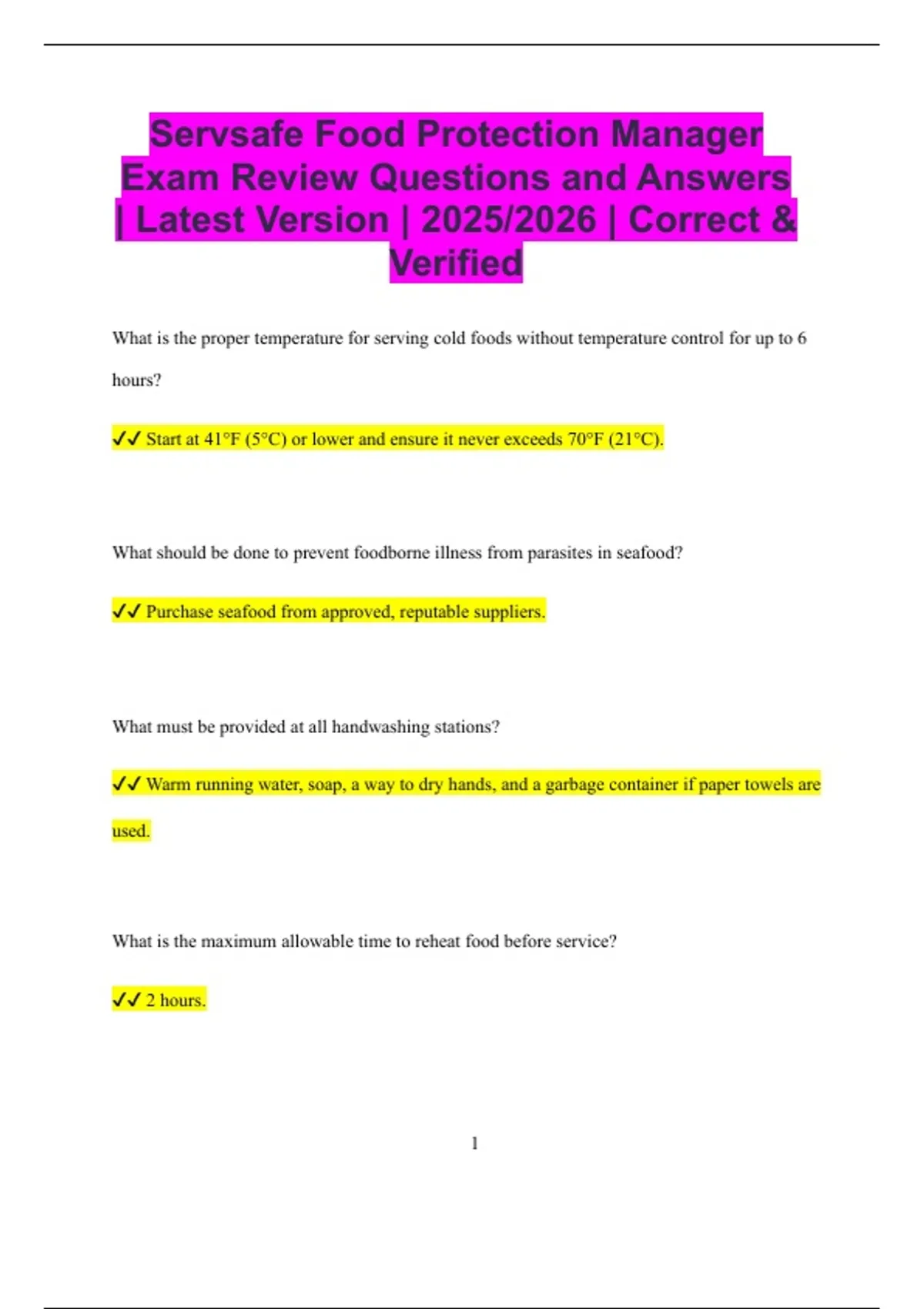 Servsafe Food Protection Manager Exam Review Questions and Answers | Latest Version | 2025/2026 | Correct & Verified What is the proper temperature for serving cold foods without temperature control for up to 6 hours? Start at 41°F (5°C) or lower and ensure it never exceeds 70°F (21°C). What should be done to prevent foodborne illness from parasites in seafood? Purchase seafood from approved, reputable suppliers. What must be provided at all handwashing stations? Warm running water, soap, a way to dry hands, and a garbage container if paper towels are used. What is the maximum allowable time to reheat food before service? 2 hours. 2 What should be done with recalled food items? Remove from inventory, label “Do Not Use,” and follow manufacturer instructions. What is the proper way to sanitize utensils using hot water? Immerse in water at 171°F (77°C) for 30 seconds. What is the correct way to handle utensils during service? Hold by handles and avoid touching food-contact surfaces. What should be done with food prepared by an employee who later reports a foodborne illness diagnosis? Discard the food. What is the correct way to use single-use gloves? Wash hands before putting on, change when contaminated, and never wash or reuse gloves. What is the purpose of a variance from the regulatory authority? To allow a foodservice operation to perform a specialized food process safely. 3 What should a manager do if they notice food being held in the danger zone during service? Discard the food and retrain employees on holding procedures. What type of sink must be used for food preparation such as washing vegetables? A designated food-prep sink. What is the main responsibility of a food protection manager? To ensure food safety practices are followed and risks of foodborne illness are minimized. What is the proper minimum internal temperature for cooking poultry? 165°F (74°C) for 15 seconds. What is the maximum amount of time TCS food can be left in the temperature danger zone? 4 hours. What should food handlers do if they have diarrhea and are scheduled to work? Report to the manager and be excluded from food handling duties. 4 What is the minimum temperature for reheating previously cooked TCS food for hot holding? 165°F (74°C) for 15 seconds.
