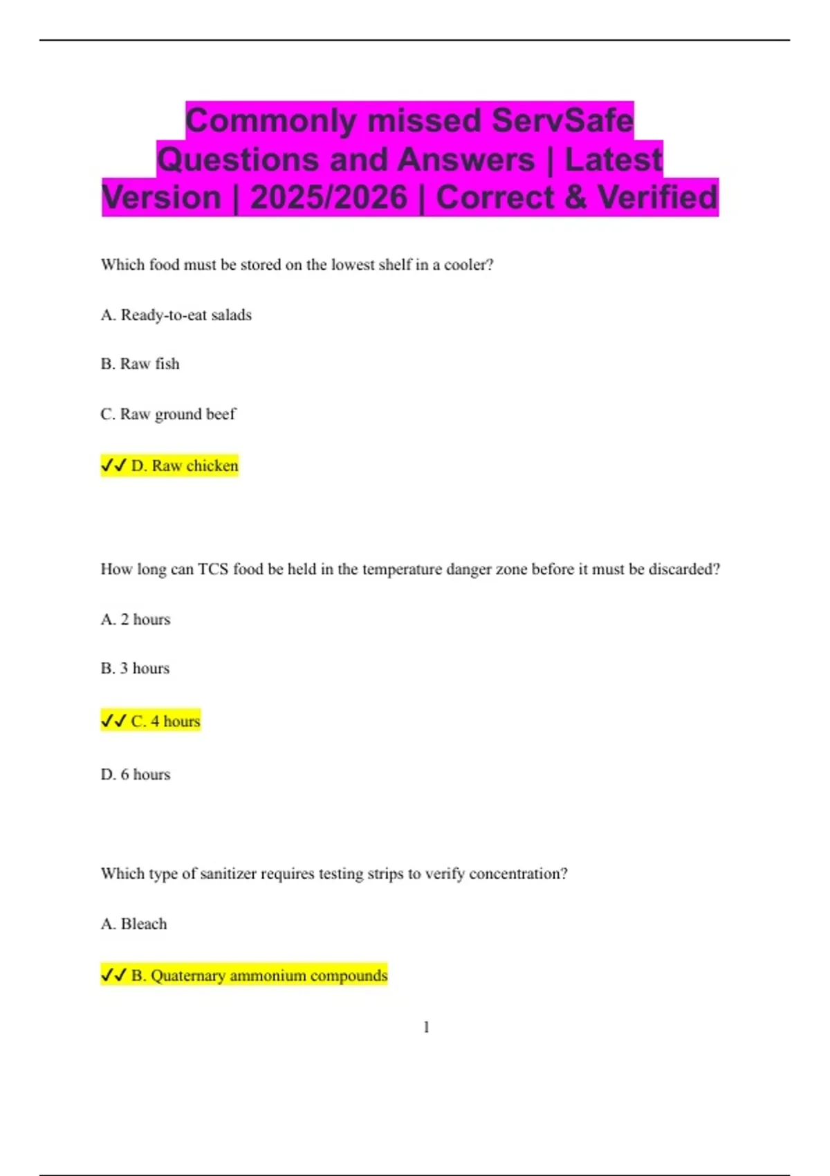 Commonly missed ServSafe Questions and Answers | Latest Version | 2025/2026 | Correct & Verified Which food must be stored on the lowest shelf in a cooler? A. Ready-to-eat salads B. Raw fish C. Raw ground beef D. Raw chicken How long can TCS food be held in the temperature danger zone before it must be discarded? A. 2 hours B. 3 hours C. 4 hours D. 6 hours Which type of sanitizer requires testing strips to verify concentration? A. Bleach B. Quaternary ammonium compounds 2 C. Vinegar D. Baking soda What should food handlers do immediately after handling raw meat and before handling ready- to-eat food? A. Rinse hands in hot water B. Wash hands with soap and water C. Use hand sanitizer only D. Wipe hands on a towel What is the minimum internal cooking temperature for ground beef patties? A. 135°F (57°C) B. 155°F (68°C) C. 160°F (71°C) D. 165°F (74°C) What is the maximum number of days ready-to-eat TCS food can be stored at 41°F (5°C)? A. 3 days 3