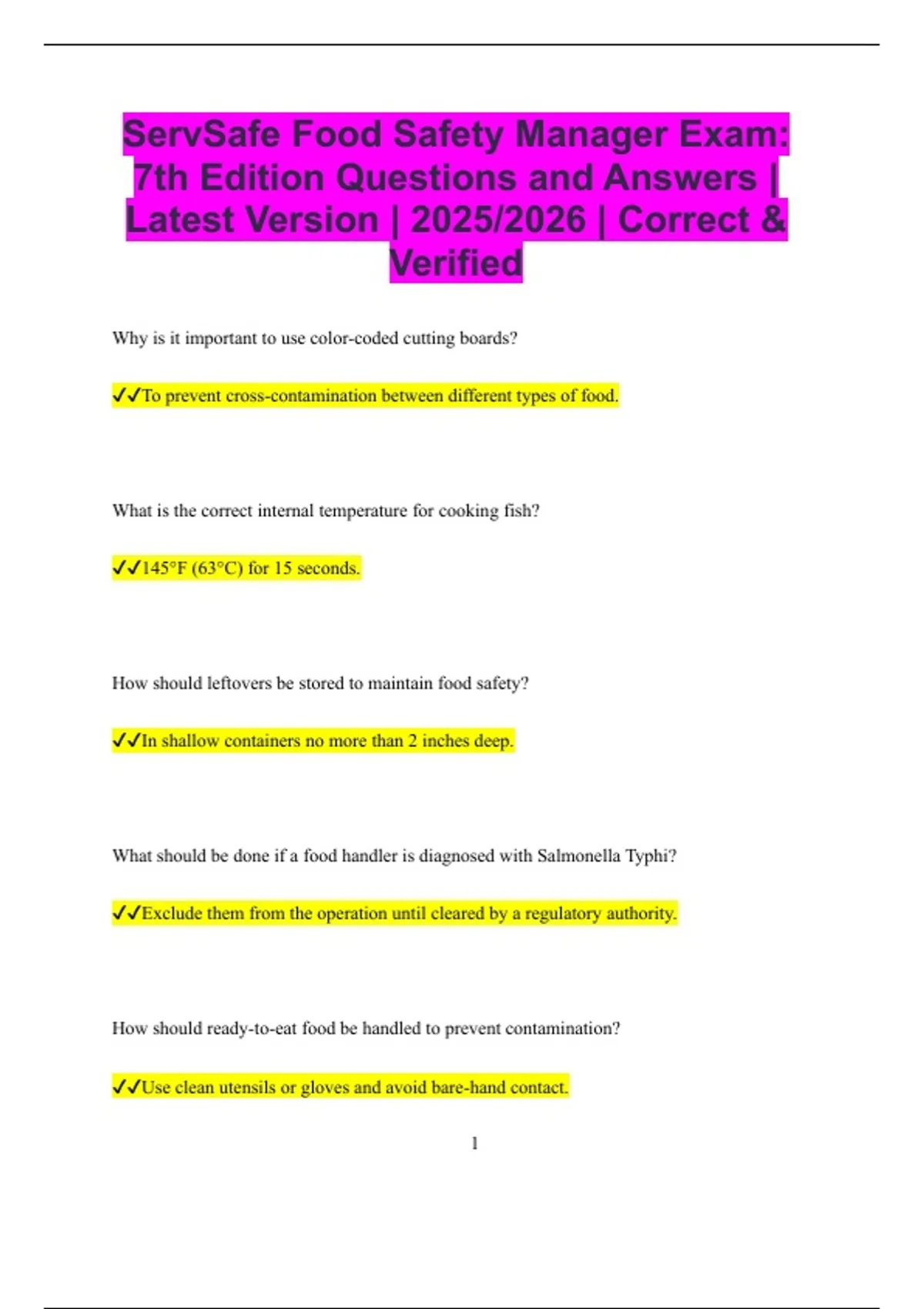 ServSafe Food Safety Manager Exam: 7th Edition Questions and Answers | Latest Version | 2025/2026 | Correct & Verified Why is it important to use color-coded cutting boards? To prevent cross-contamination between different types of food. What is the correct internal temperature for cooking fish? 145°F (63°C) for 15 seconds. How should leftovers be stored to maintain food safety? In shallow containers no more than 2 inches deep. What should be done if a food handler is diagnosed with Salmonella Typhi? Exclude them from the operation until cleared by a regulatory authority. How should ready-to-eat food be handled to prevent contamination? Use clean utensils or gloves and avoid bare-hand contact. 2 What is the safest way to reheat leftover soup for hot-holding? Heat to 165°F (74°C) within 2 hours. Why is time and temperature control critical for TCS food? To prevent the rapid growth of harmful bacteria. What is the proper method for washing fruits and vegetables? Rinse under running water before cutting, cooking, or serving. How should a food handler clean a cutting board after preparing raw chicken? Wash with hot, soapy water, rinse, sanitize, and air-dry. What is the proper temperature for storing frozen food? 0°F (-18°C) or lower. Why should raw and ready-to-eat foods never be stored together? To prevent cross-contamination from raw foods to ready-to-eat foods. 3 What is the first thing a food manager should do if a customer reports a foodborne illness? Document the complaint and inform the regulatory authority if necessary. How often should handwashing sinks be checked and maintained? Daily to ensure soap, warm water, and paper towels are available. How often should food-contact surfaces be cleaned and sanitized? After each use and whenever switching to a different type of food. What is the proper way to store raw seafood in a refrigerator? Below ready-to-eat food and in a sealed container. How long can ready-to-eat TCS food be safely stored in a refrigerator at 41°F? Up to 7 days. What is the correct way to cool hot food quickly? Reduce from 135°F to 70°F within 2 hours, then from 70°F to 41°F within 4 hours. 4 What should a food handler do if they have a sore throat with a fever? Report the illness to the manager and avoid handling food. What is the proper way to store chemicals in a foodservice operation? In a separate area away from food, utensils, and equipment. How can cross-contamination be prevented in a refrigerator? Store raw meats, seafood, and poultry below ready-to-eat foods in separate containers. What is the first step in handwashing? Wet hands and arms with warm running water. How should a food thermometer be calibrated? Using the ice-point method or boiling-point
