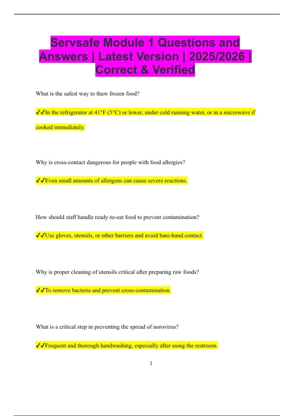 Servsafe Module 1 Questions and Answers | Latest Version | 2025/2026 | Correct & Verified What is the safest way to thaw frozen food? In the refrigerator at 41°F (5°C) or lower, under cold running water, or in a microwave if cooked immediately. Why is cross-contact dangerous for people with food allergies? Even small amounts of allergens can cause severe reactions. How should staff handle ready-to-eat food to prevent contamination? Use gloves, utensils, or other barriers and avoid bare-hand contact. Why is proper cleaning of utensils critical after preparing raw foods? To remove bacteria and prevent cross-contamination. What is a critical step in preventing the spread of norovirus? Frequent and thorough handwashing, especially after using the restroom. 2 How should leftovers be stored to maintain safety? In shallow, covered containers and refrigerated at 41°F (5°C) or below. What is the proper handwashing procedure? Wet hands, use soap, scrub for at least 20 seconds, rinse, and dry with a single-use towel. Why should food-contact surfaces be cleaned and sanitized frequently? To prevent the spread of pathogens to food. How can storing raw meat above ready-to-eat foods affect food safety? It can cause cross-contamination if juices drip onto ready-to-eat foods. What is the correct way to cool hot food quickly? Use shallow containers and refrigerate or ice baths to reach 41°F (5°C) within 6 hours. Why is it important to monitor time and temperature during food storage? To ensure food remains safe and bacteria do not grow. 3 What is a key factor that makes TCS foods hazardous? They provide an ideal environment for bacterial growth. Why should food handlers avoid working when vomiting or having diarrhea? To prevent spreading pathogens to food and customers. What is the proper way to store chemicals in a foodservice operation? Separate from food, food-contact surfaces, and utensils. Why should a food thermometer be used instead of judging doneness by appearance? Because visual cues are unreliable and do not ensure pathogens are destroyed. What is the main purpose of food safety training in a foodservice operation? To prevent foodborne illness and protect customers. What does TCS food stand for? Time/Temperature Control for Safety food. 4 Why is it important to wash hands before preparing food? To remove harmful pathogens that can cause foodborne illness. Which temperature range is known as the temperature danger zone? 41°F to 135°F (5°C to 57°C). Why should food be cooked to proper internal temperatures?