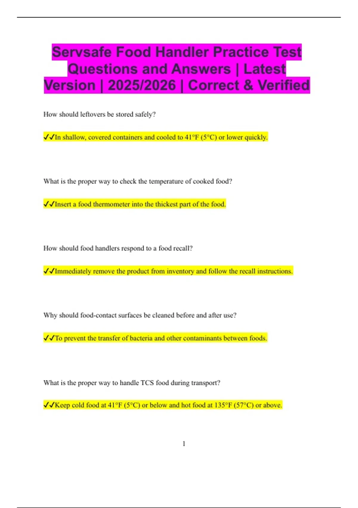 Servsafe Food Handler Practice Test Questions and Answers | Latest Version | 2025/2026 | Correct & Verified How should leftovers be stored safely? In shallow, covered containers and cooled to 41°F (5°C) or lower quickly. What is the proper way to check the temperature of cooked food? Insert a food thermometer into the thickest part of the food. How should food handlers respond to a food recall? Immediately remove the product from inventory and follow the recall instructions. Why should food-contact surfaces be cleaned before and after use? To prevent the transfer of bacteria and other contaminants between foods. What is the proper way to handle TCS food during transport? Keep cold food at 41°F (5°C) or below and hot food at 135°F (57°C) or above. 2 How should a food handler clean a cutting board after preparing raw poultry? Wash with hot, soapy water, rinse, sanitize, and air-dry. What is the proper handwashing procedure? Wet hands with warm water, scrub with soap for 20 seconds, rinse, and dry with a disposable towel. Why should food handlers avoid working when they have a sore throat with fever? To prevent spreading foodborne illness to customers. What is the proper way to store dry goods like flour or sugar? In clean, dry, sealed containers at least 6 inches off the floor. How should raw meat be stored in the freezer? At 0°F (-18°C) or lower in sealed containers. What is the first step in cleaning and sanitizing dishes? Remove food debris and rinse before washing with hot, soapy water. 3 How should food handlers handle ready-to-eat food at a buffet? Use clean utensils, protect food from customer contact, and replace utensils regularly. Why should food handlers avoid using the same cutting board for raw meat and vegetables? To prevent cross-contamination between raw and ready-to-eat foods. What is the proper procedure if a food handler has a diagnosed foodborne illness? Report to the manager and be excluded from working until cleared by a regulatory authority. Why is it important to monitor food temperatures regularly? To ensure food stays out of the temperature danger zone and prevent bacterial growth. What is the first step a food handler should take before starting food preparation? Wash hands thoroughly with warm water and soap for at least 20 seconds. Why is it important to keep fingernails short and clean in food service? To prevent bacteria and dirt from contaminating food. 4 How should a food handler cover a cut on their hand? With a clean bandage and a single-use glove. What is the proper way to thaw frozen meat safely? In the refrigerator at 41°F (5°C) or below. How often should handwashing be performed in a food service operation? Before handling food, after using the restroom,